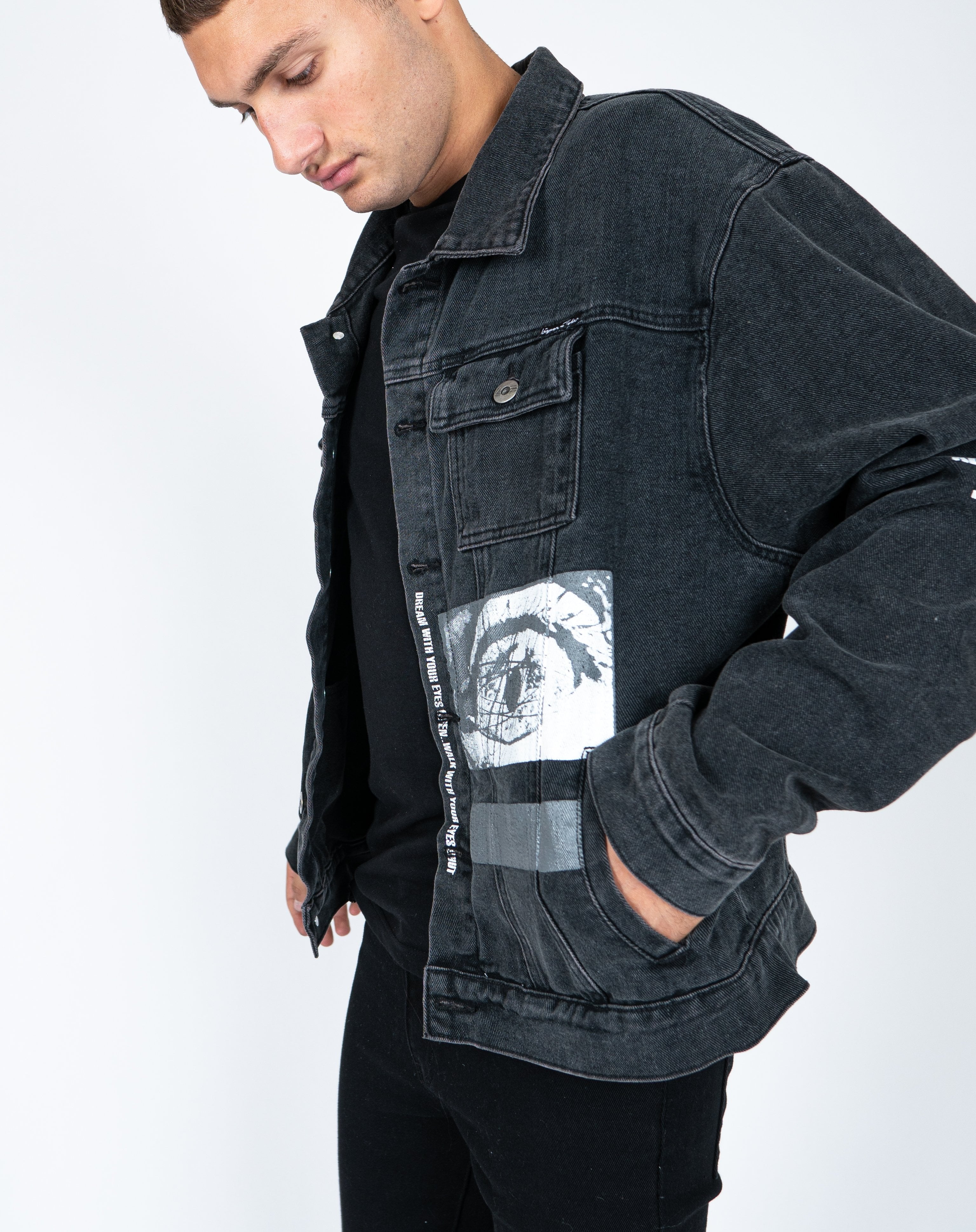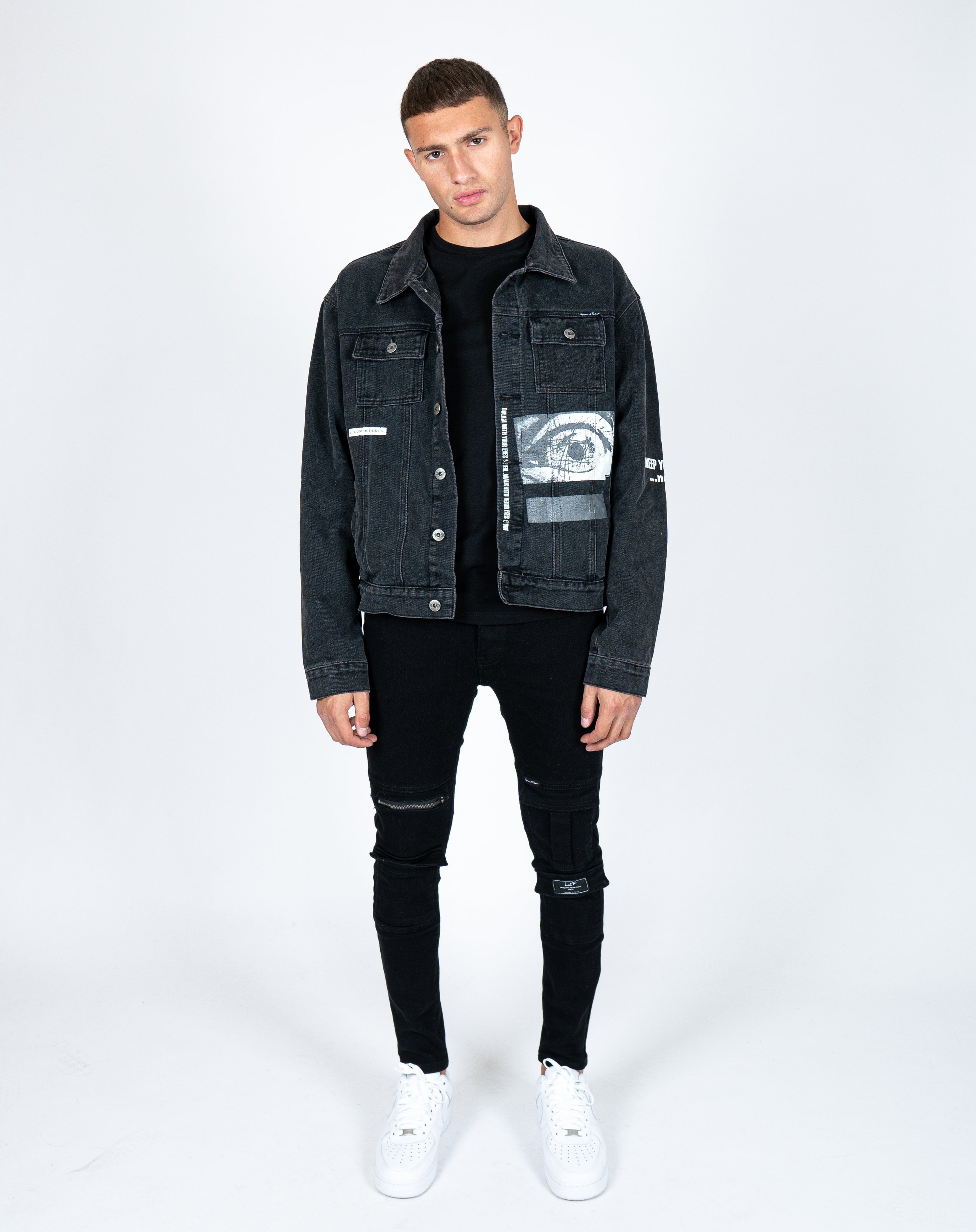 Oversized Trucker Jacket In Black Floral And Blue Paisley Splicing