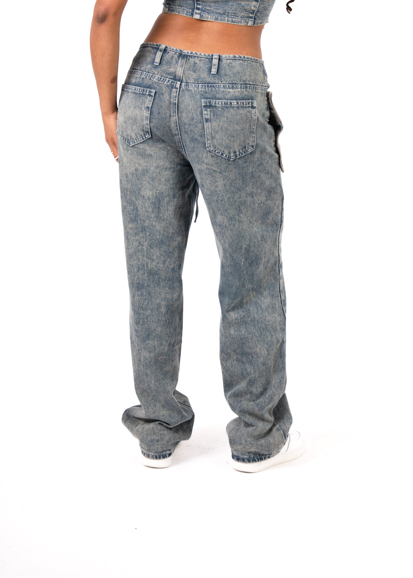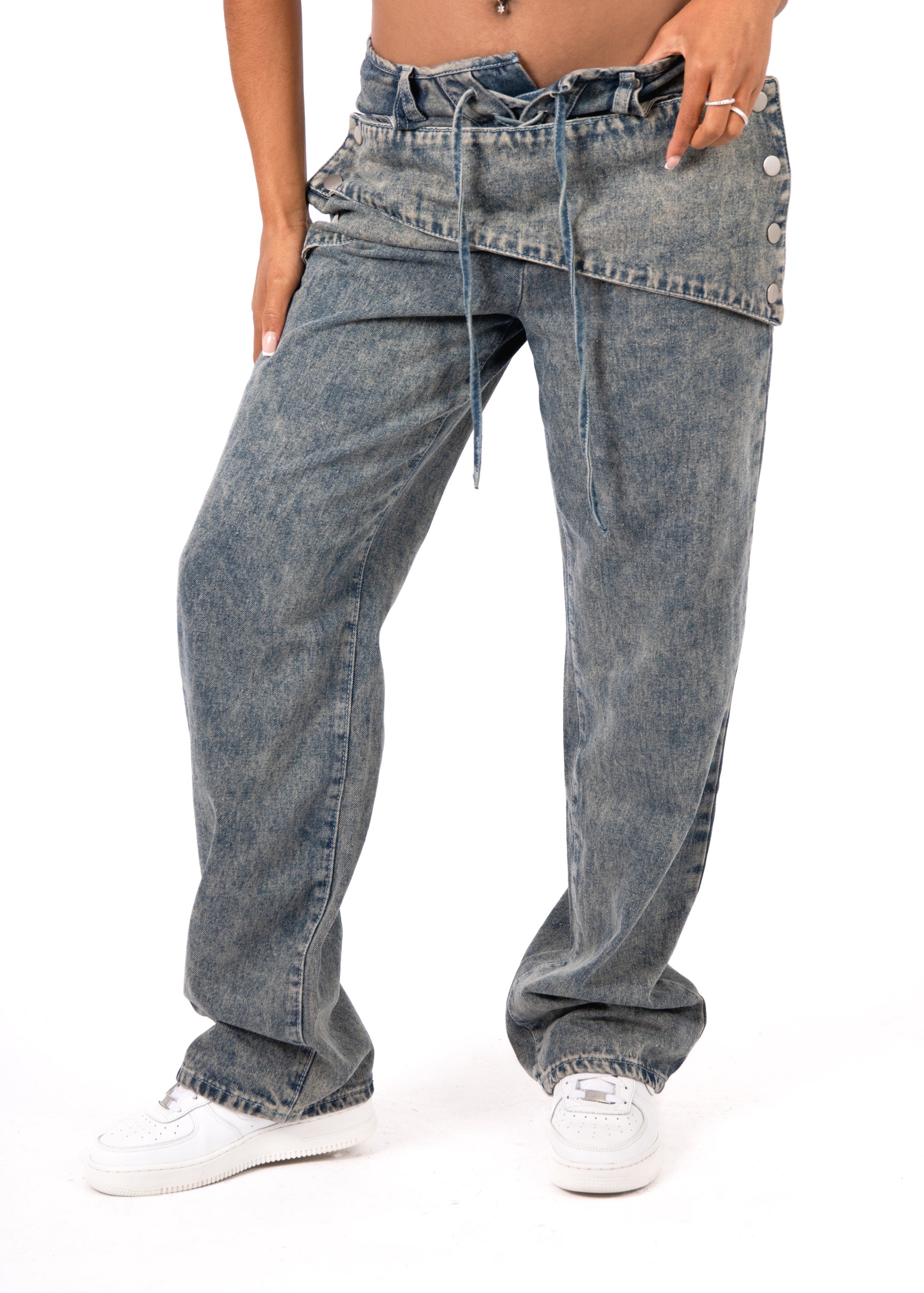 Stonewash Tie Front & Wrap Belted Front Straight Leg Jeans