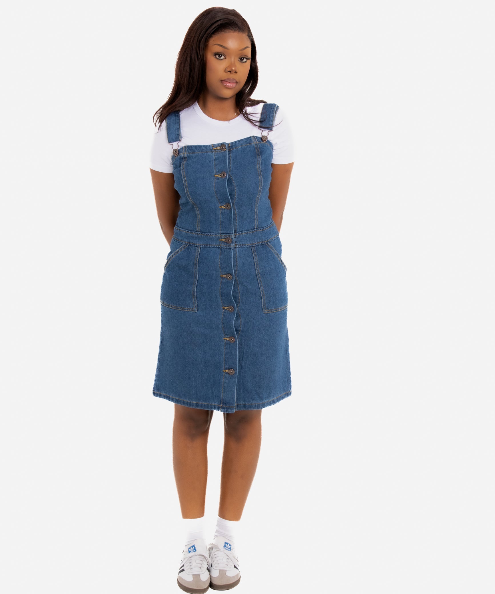 Lexi Denim Mini Dress With Buckle Straps In Stonewash