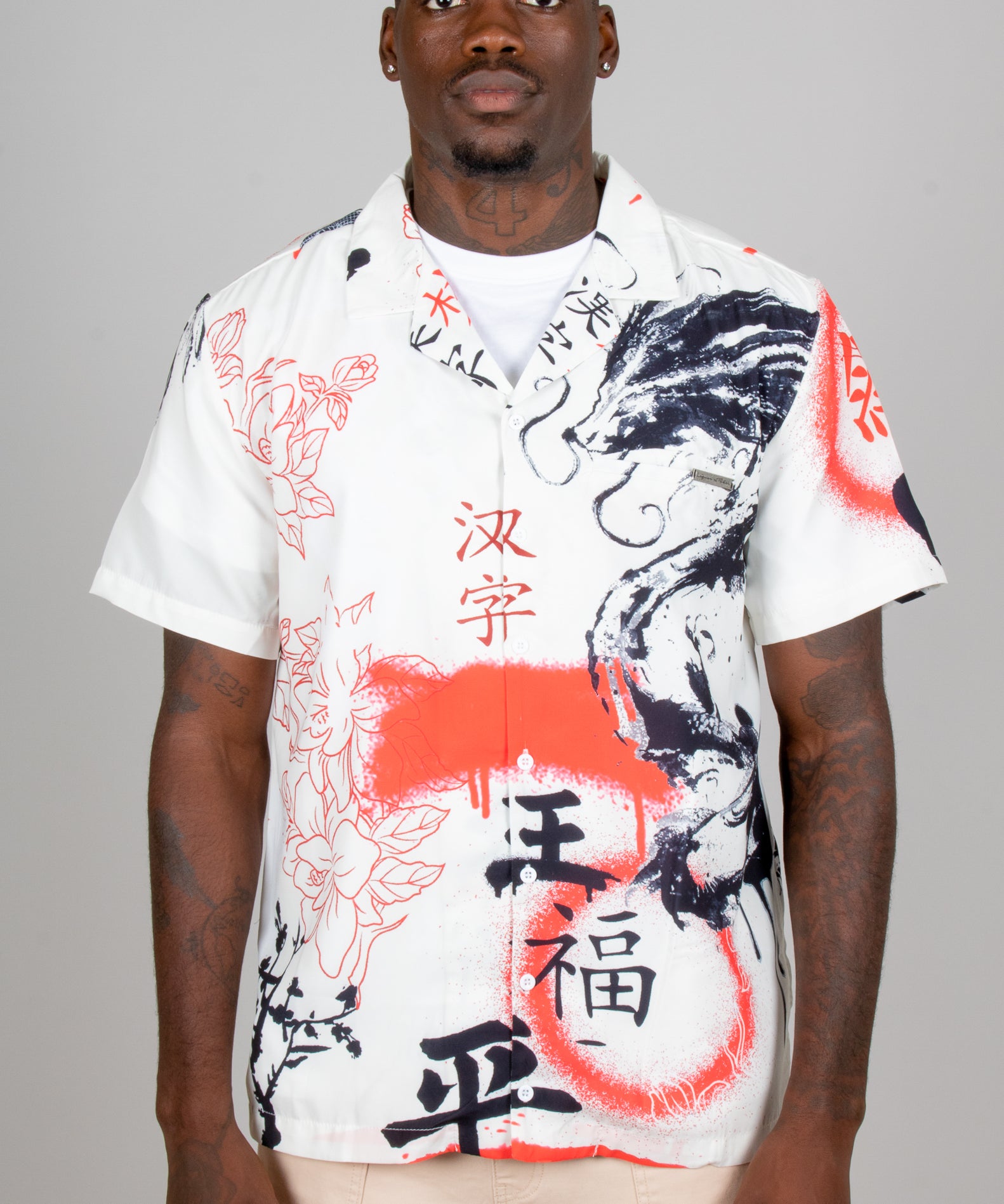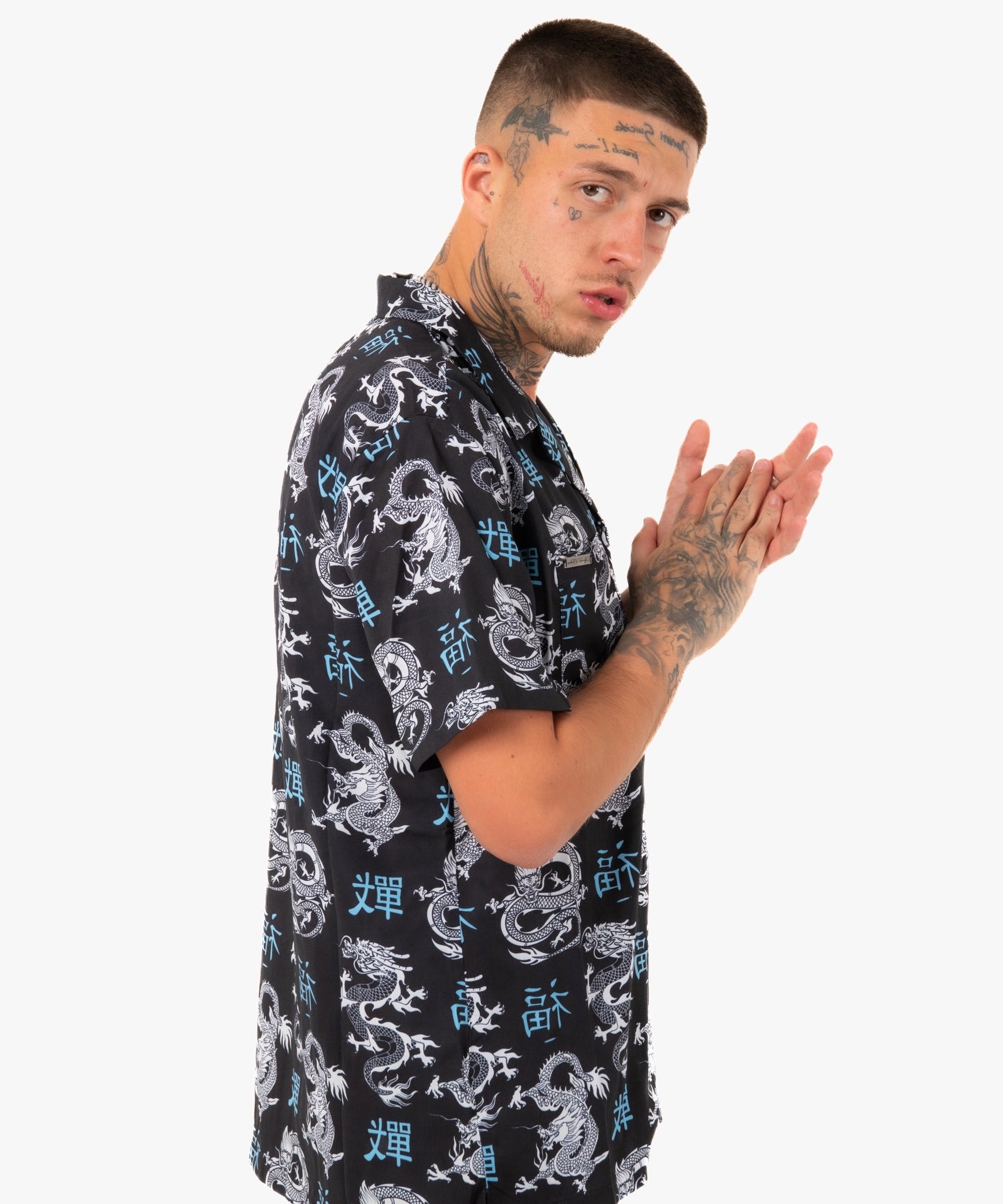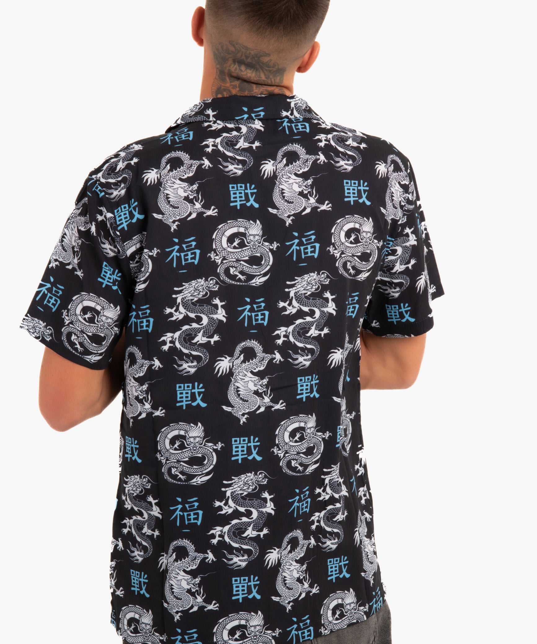 All-Over Dragon Print Short Sleeve Black Shirt