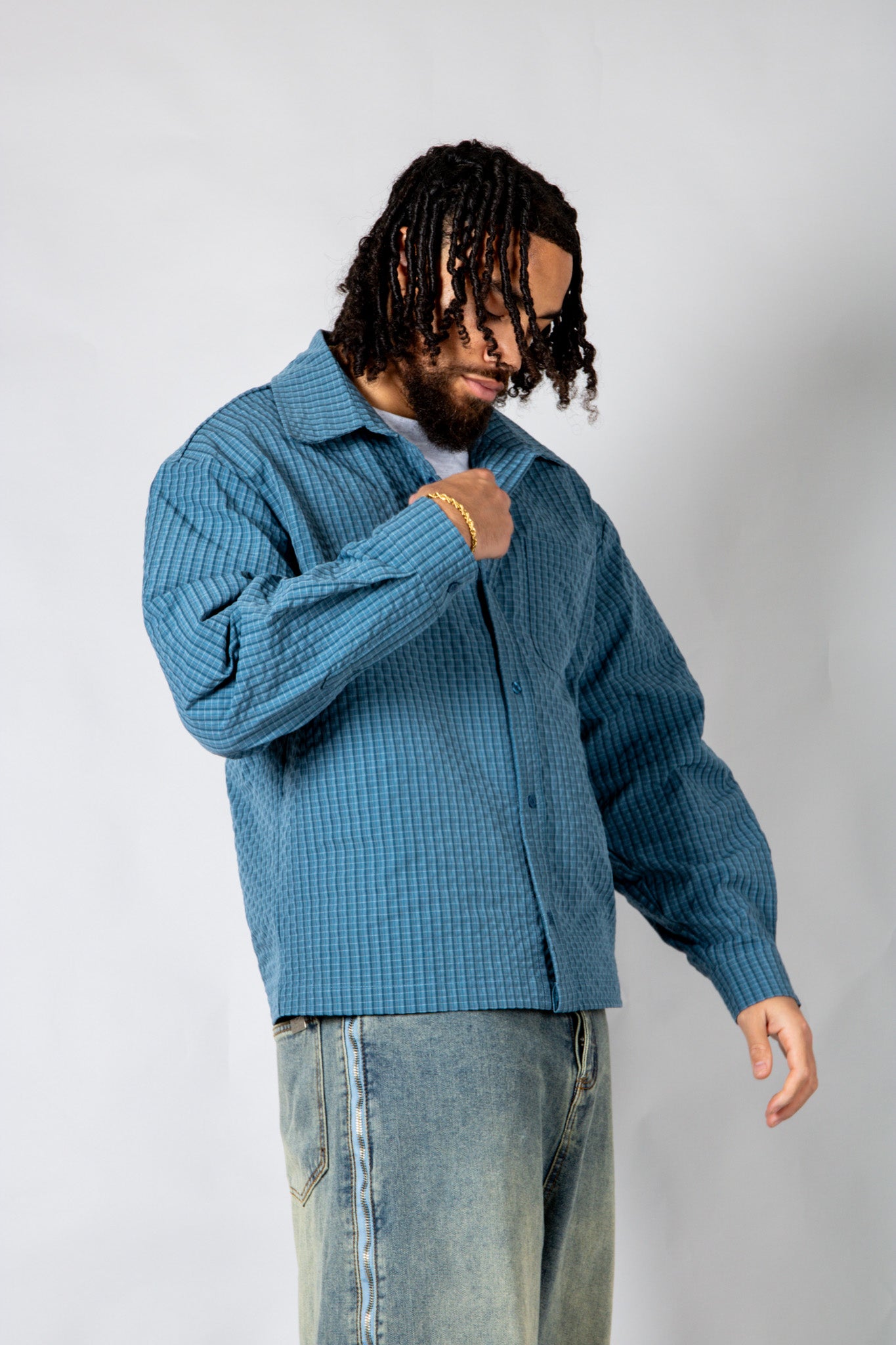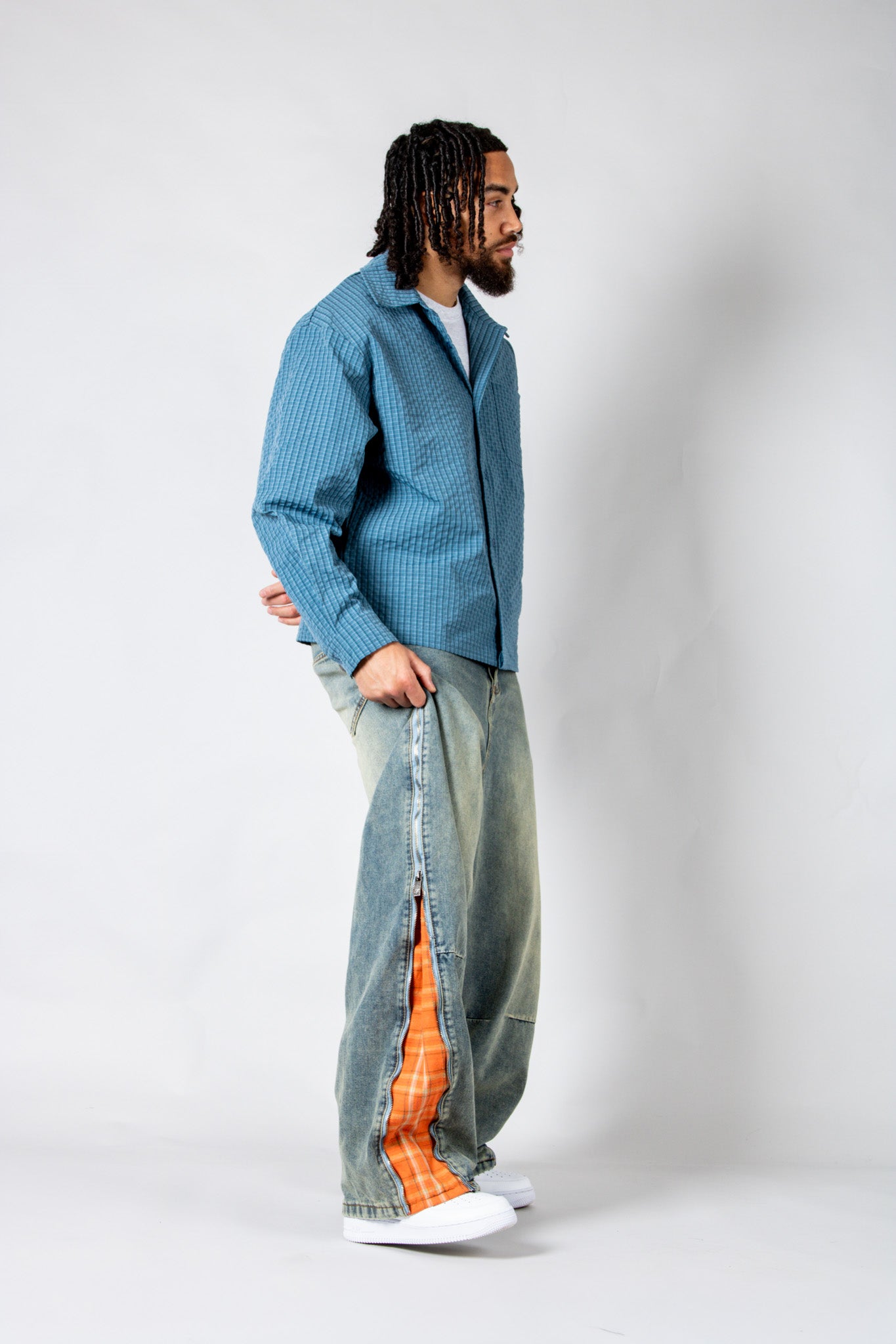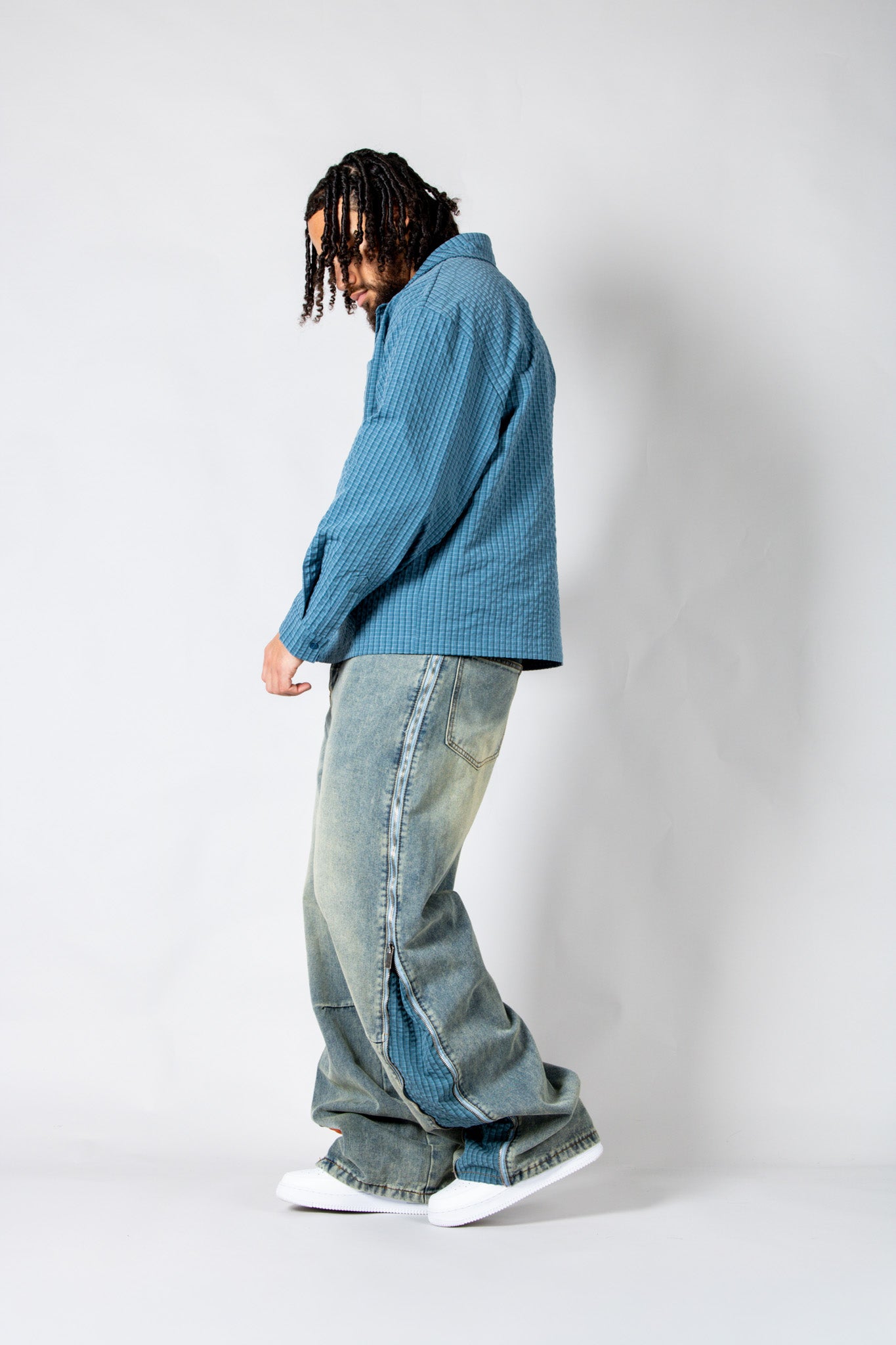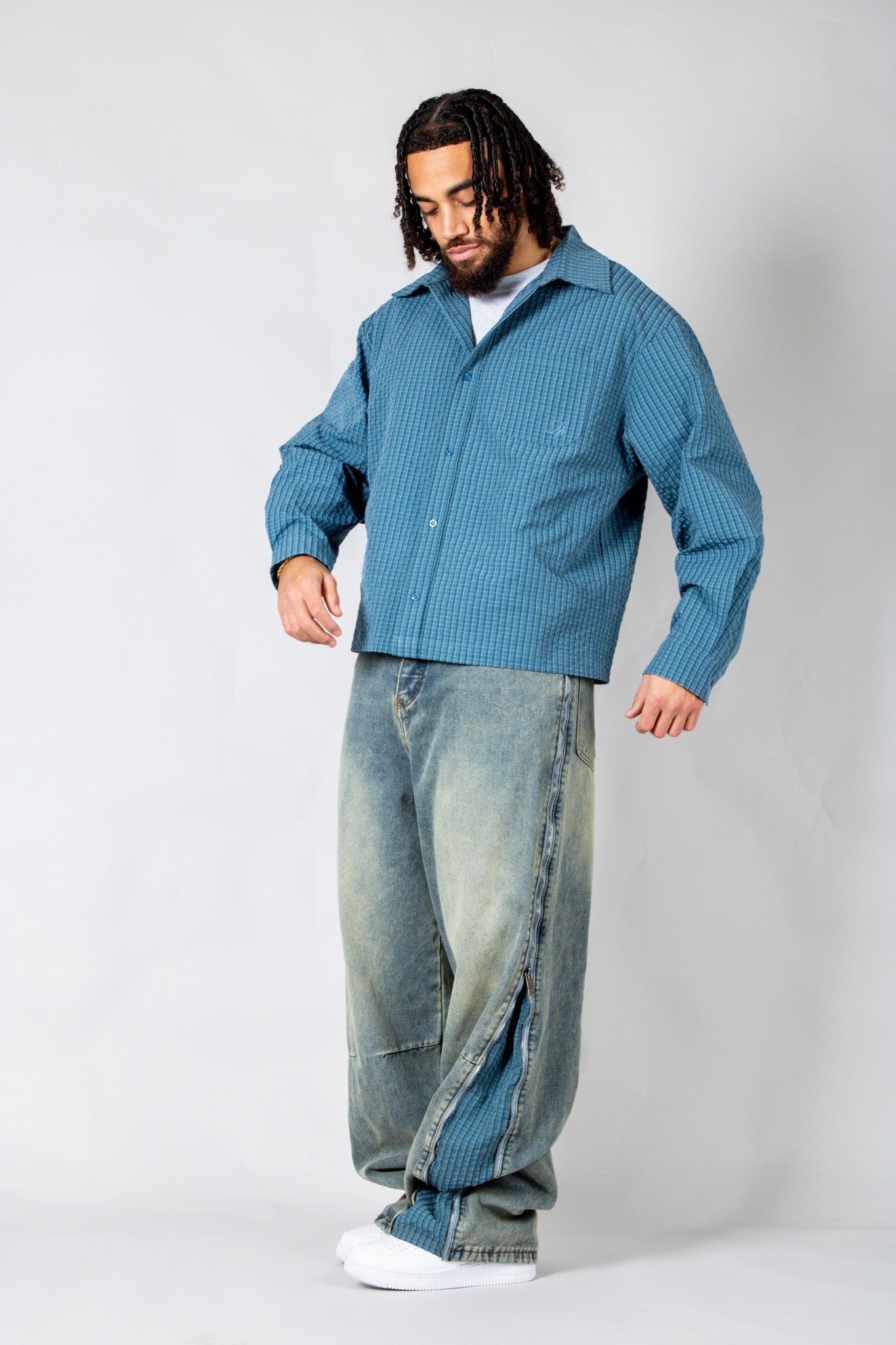 Sharp, versatile, and easy to style — the blue check zip-up shirt blends classic pattern with signature detailing for everyday edge.