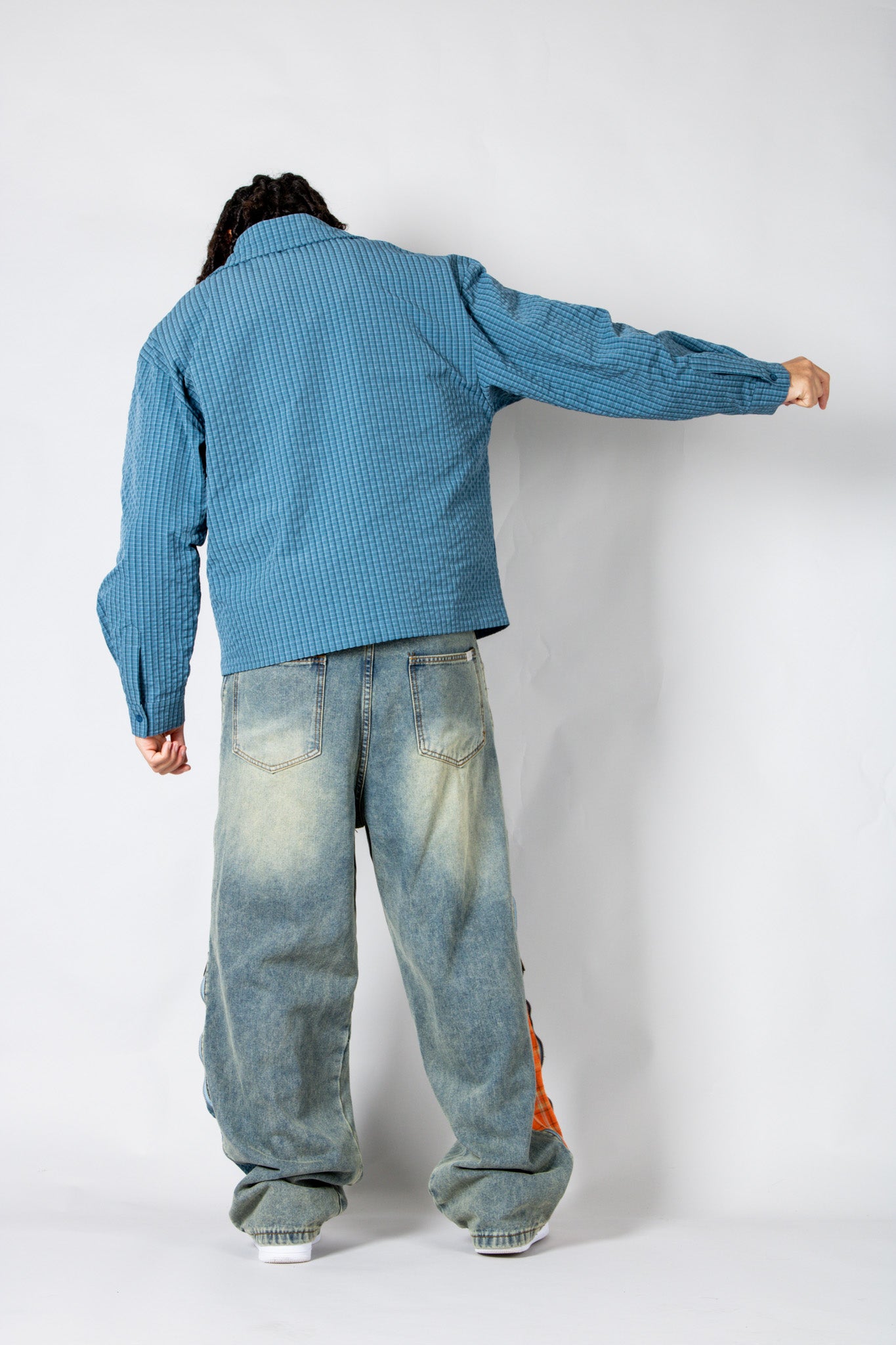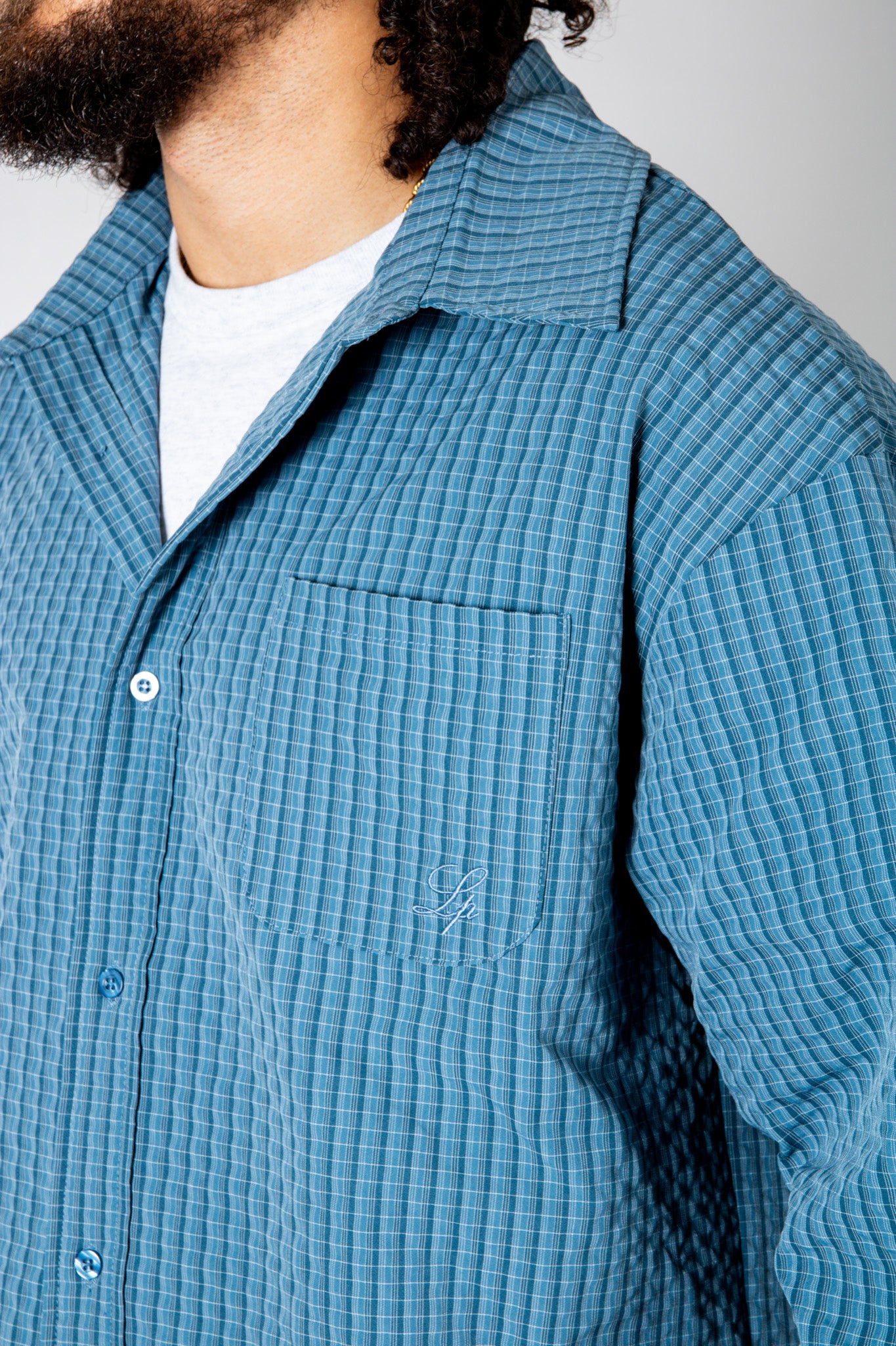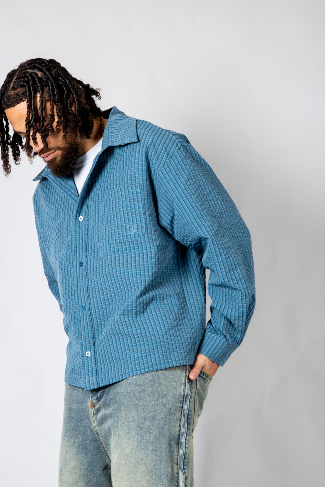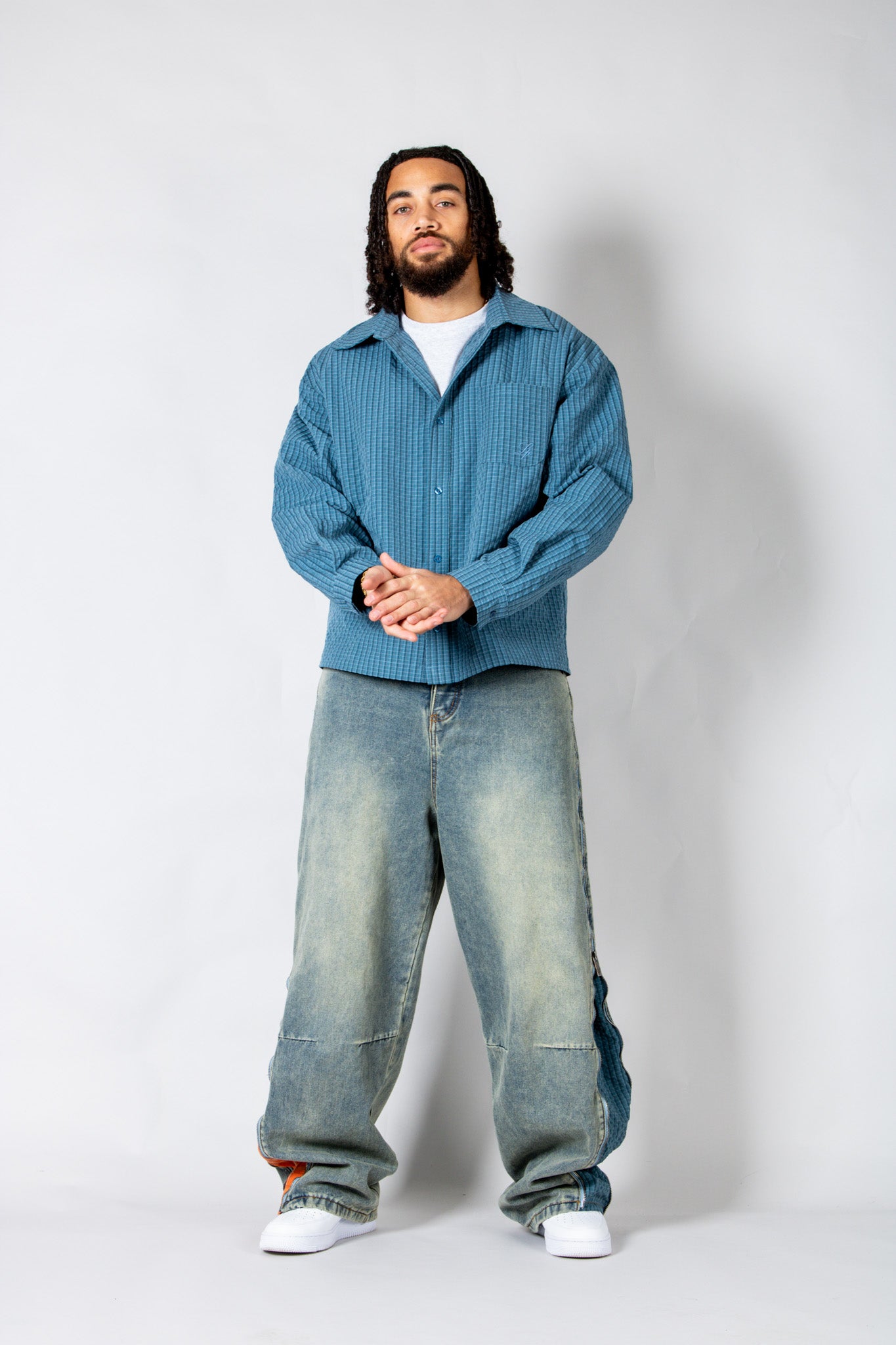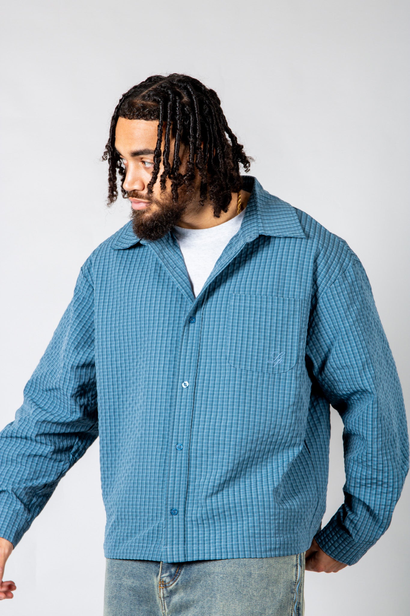 Sharp, versatile, and easy to style — the blue check zip-up shirt blends classic pattern with signature detailing for everyday edge.