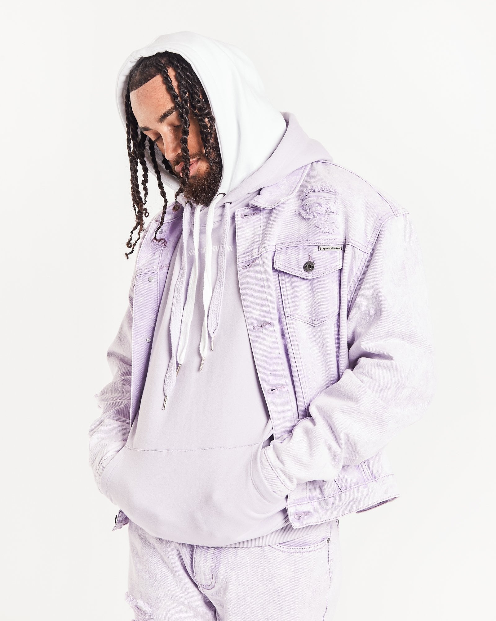Introducing our Lilac Oversized Distressed Trucker Jacket! This unique piece is all about making a bold style statement. The eye-catching lilac color and acid wash finish bring a fresh twist to the classic trucker jacket. With its oversized fit and distressing details, it's the epitome of contemporary cool.