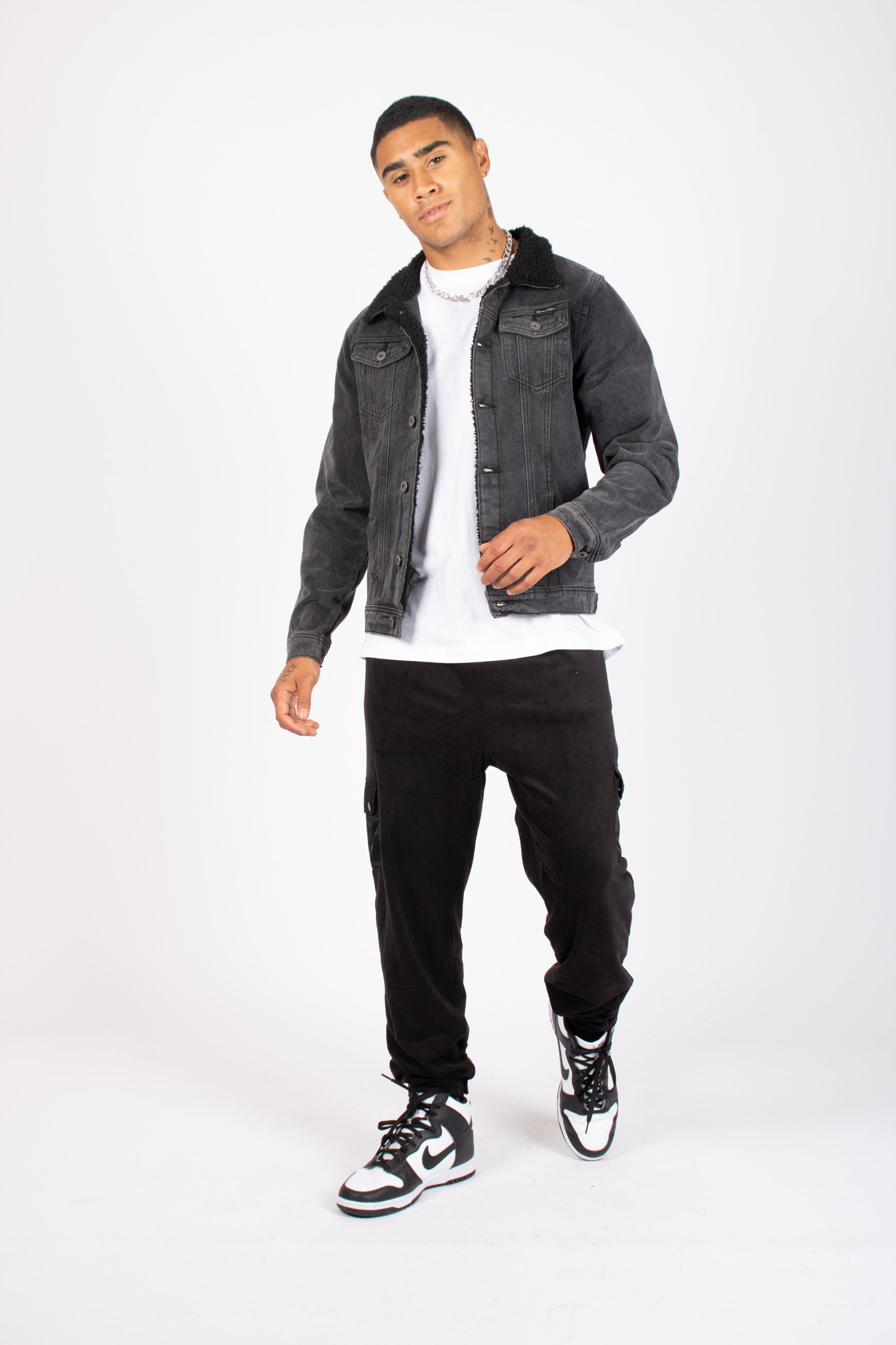 Norton Slim Fit Denim Jacket With Borg Collar In Washed Black