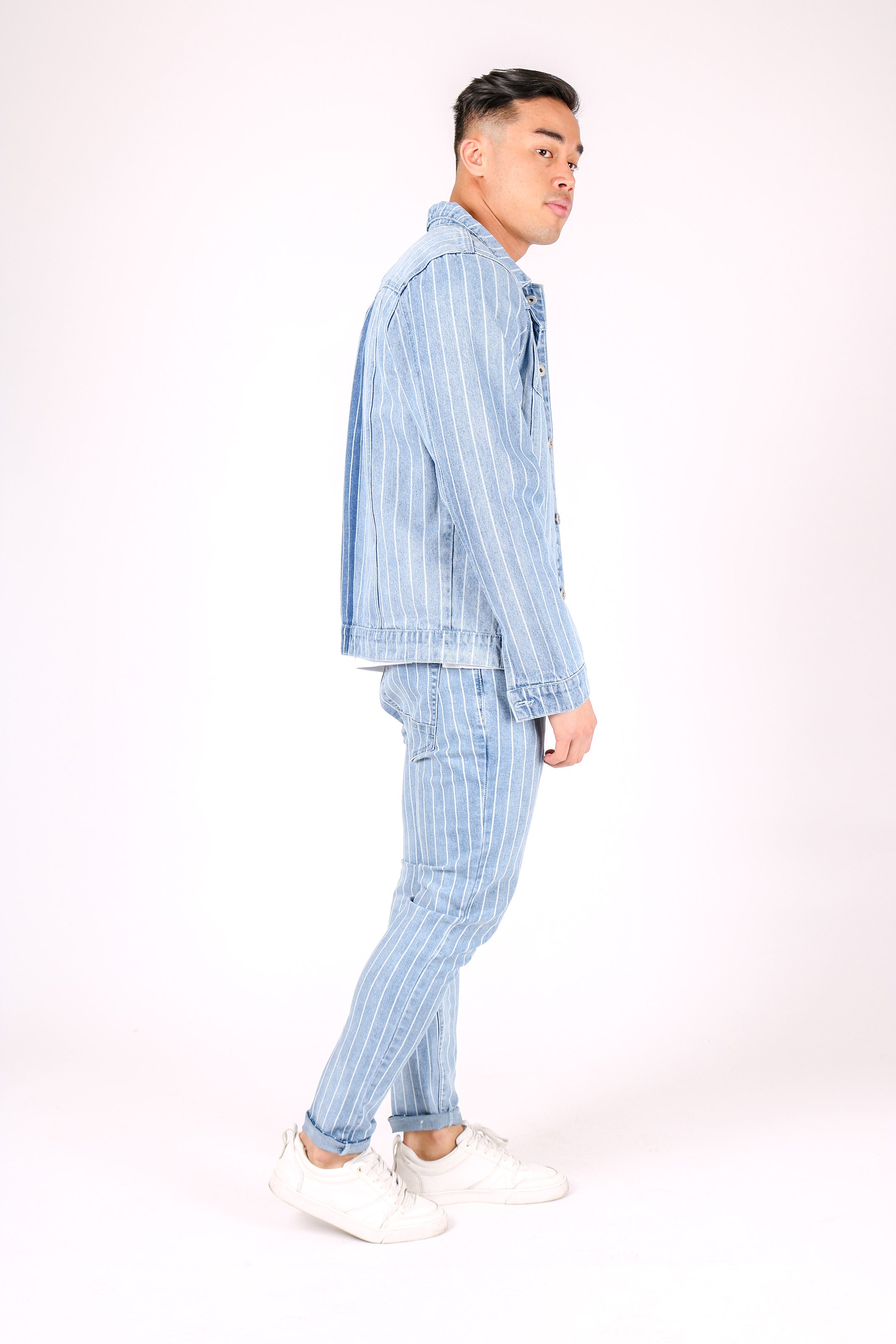 - A blend of two pinstripe denims