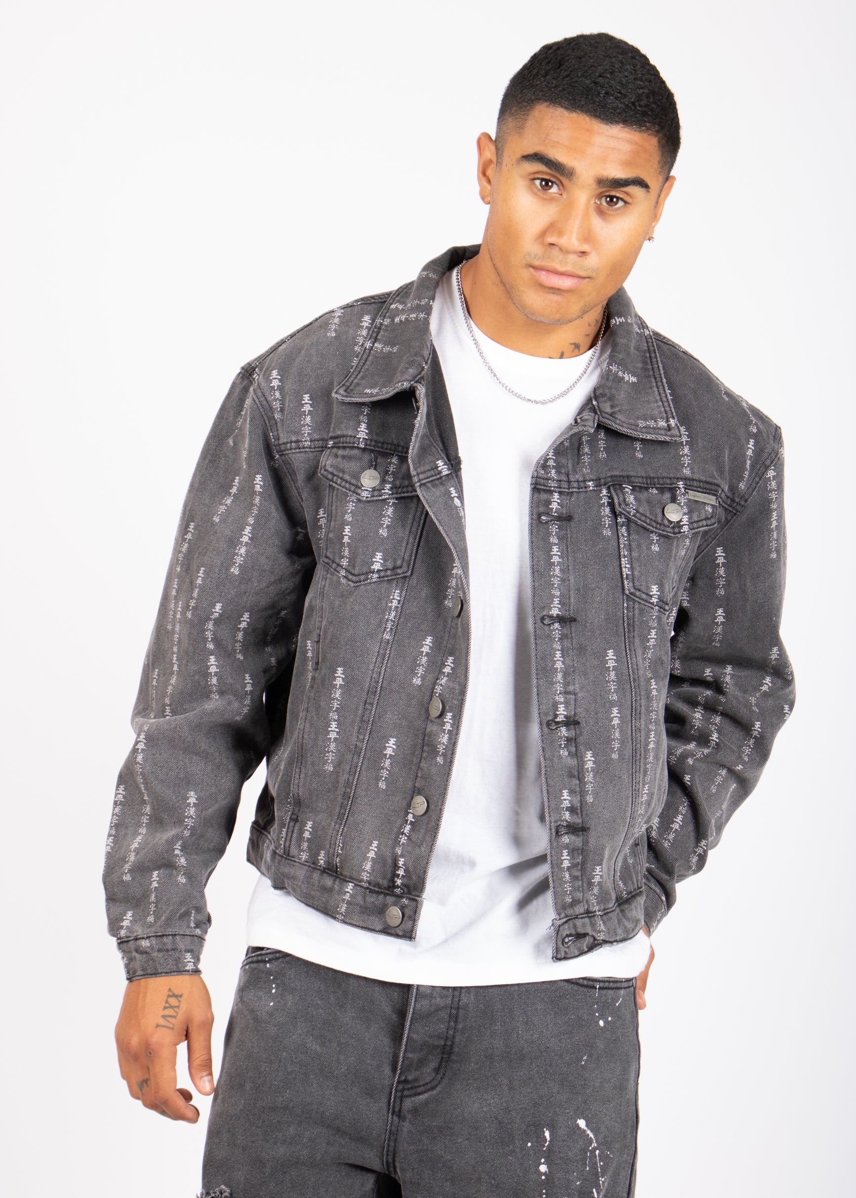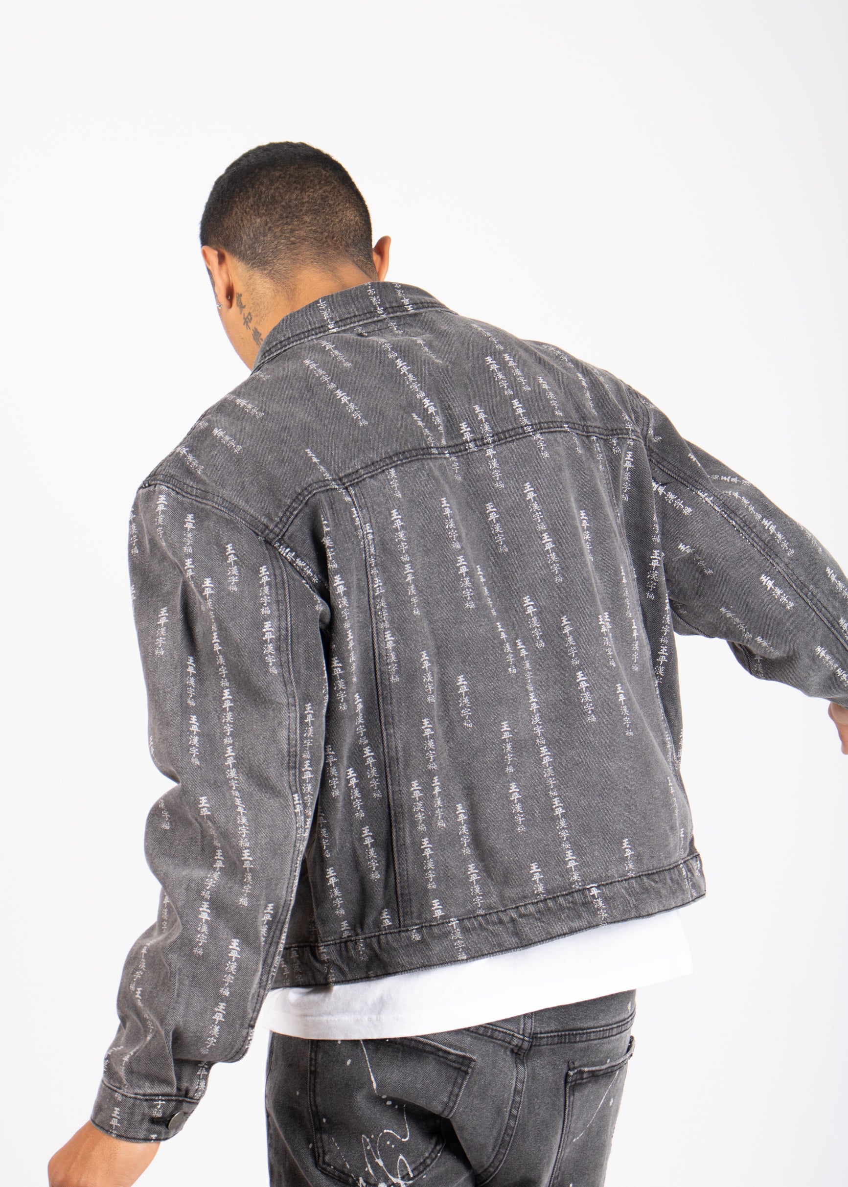 All-Over Japanese Text Oversized Washed Black Trucker Jacket