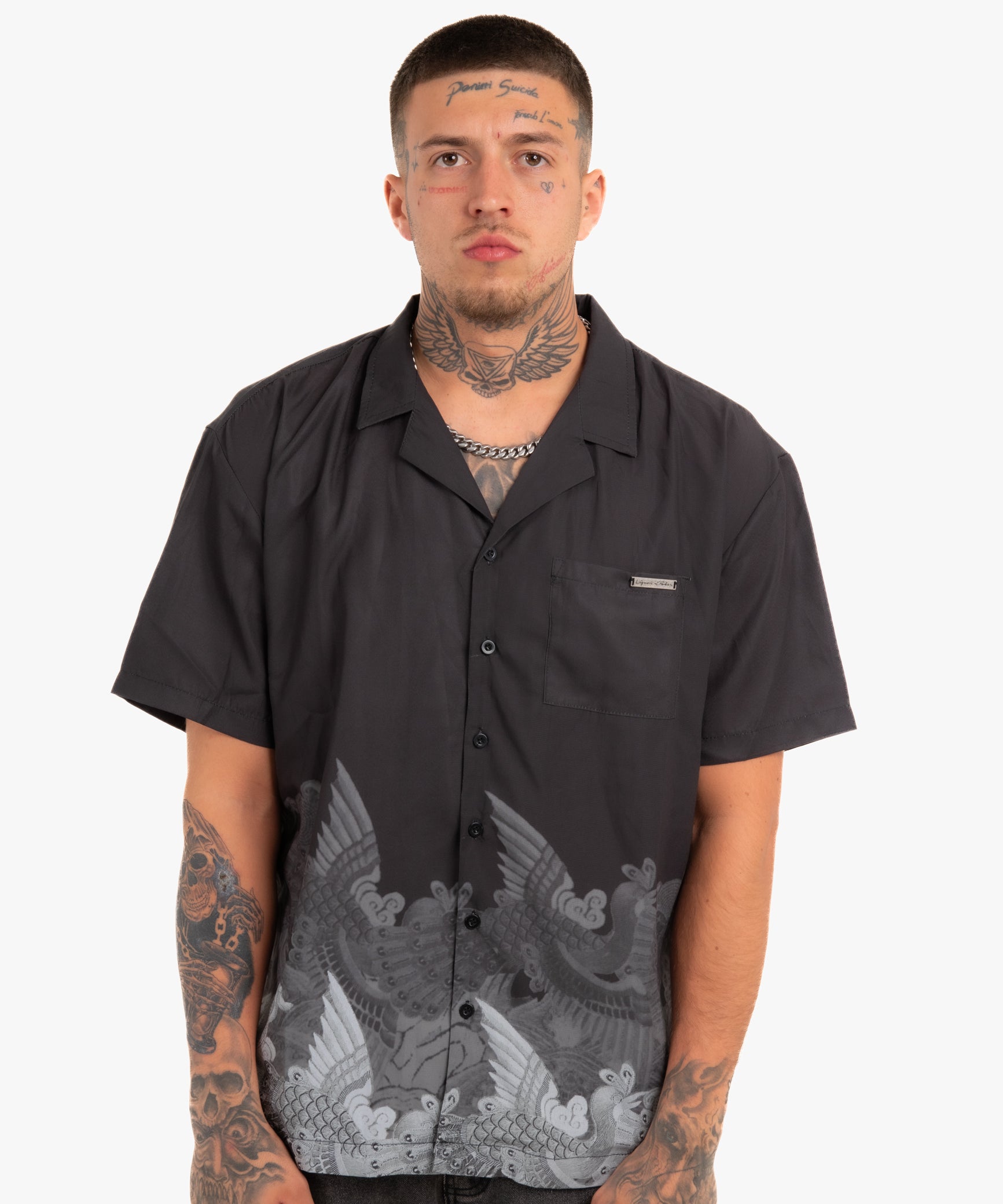 Oversized Boxy Shirt With Ombre Japanese Bird Print
