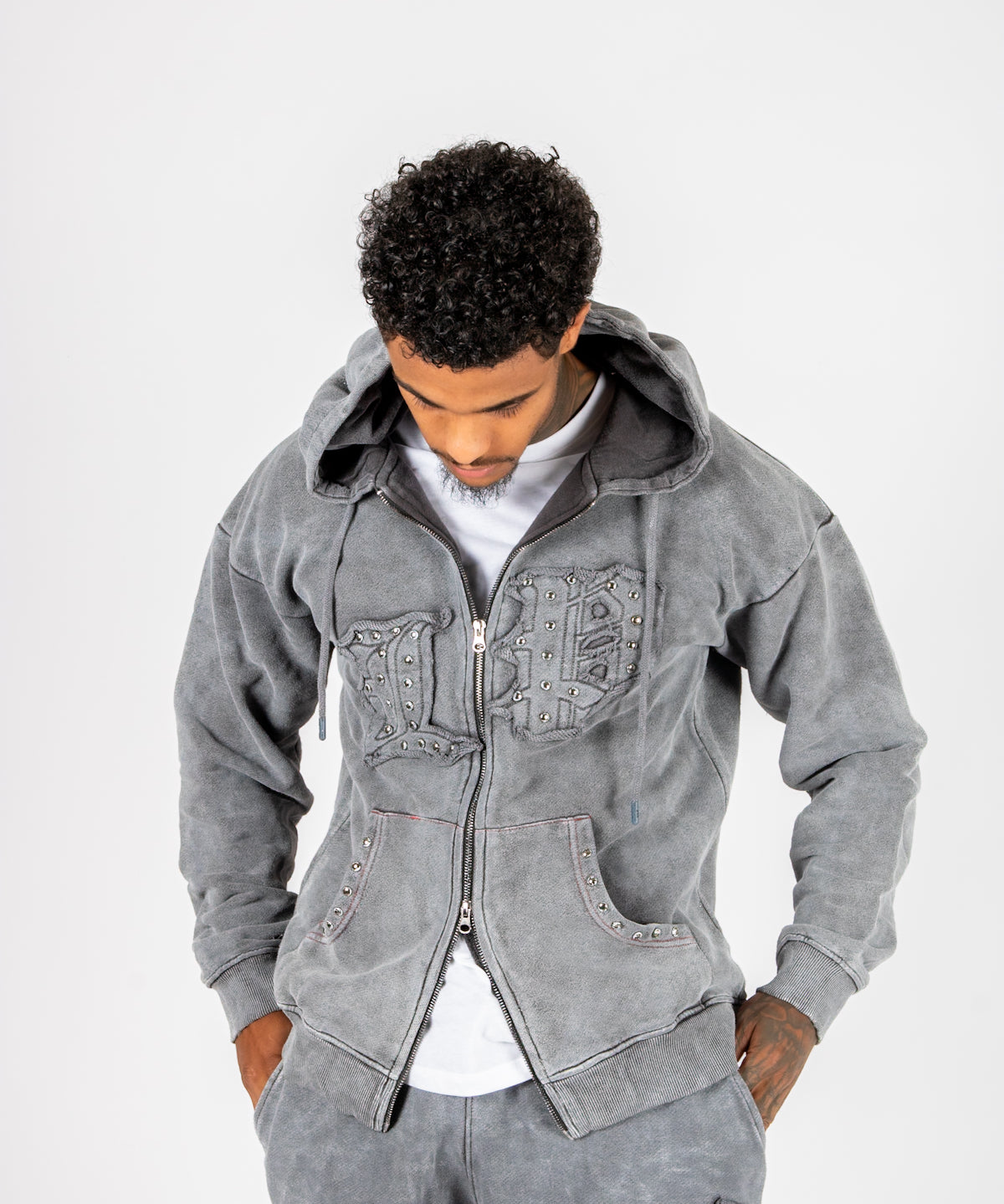 Oversized Washed Grey Appliqué & Stud Detail Hoodie