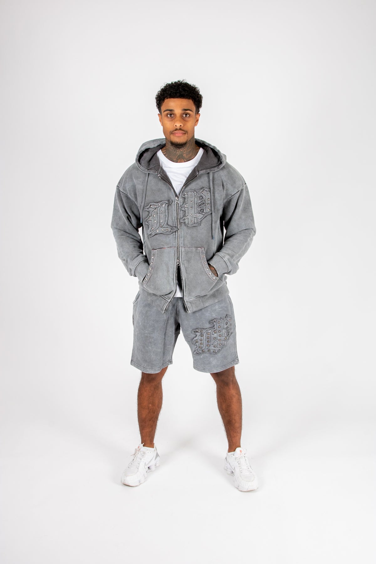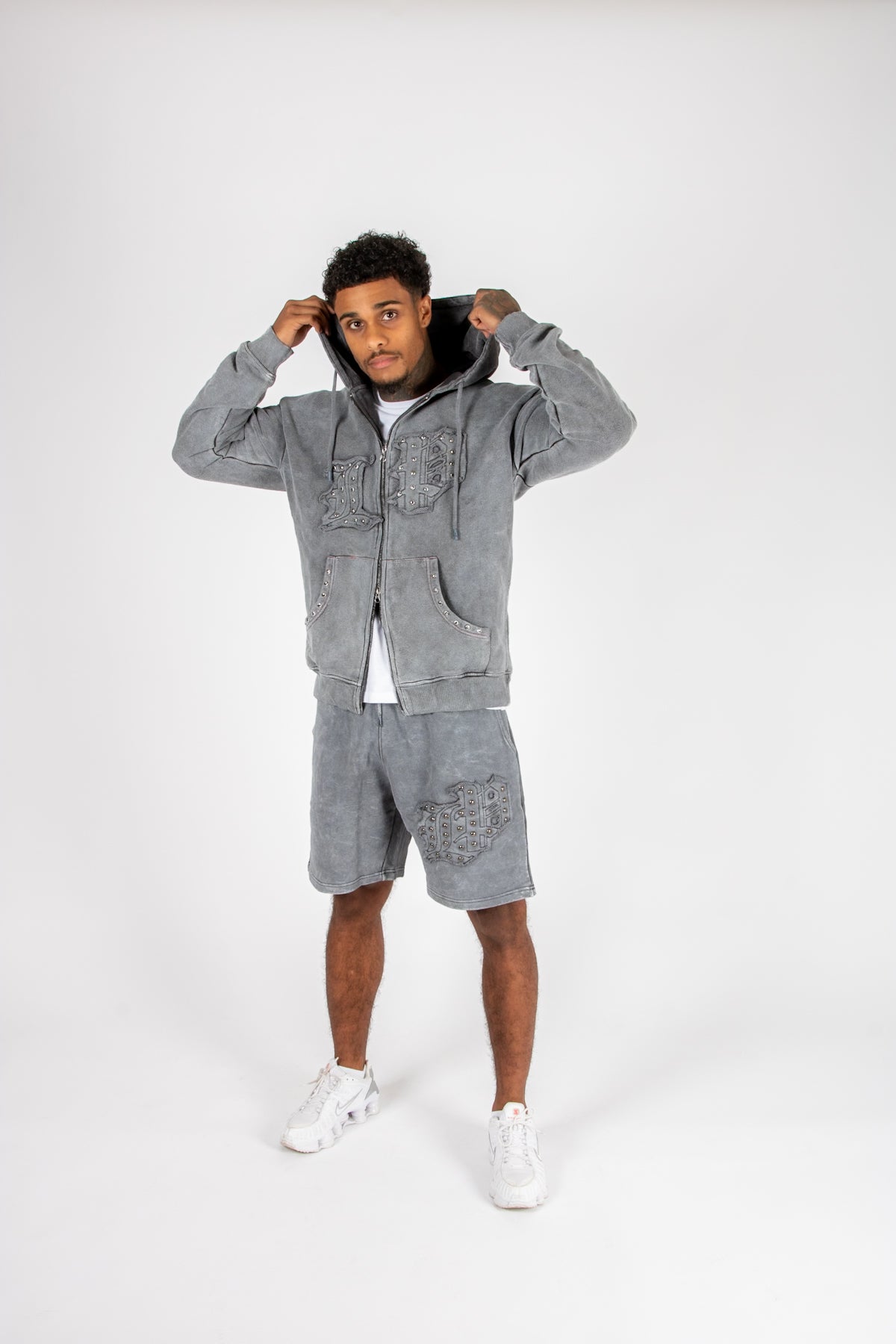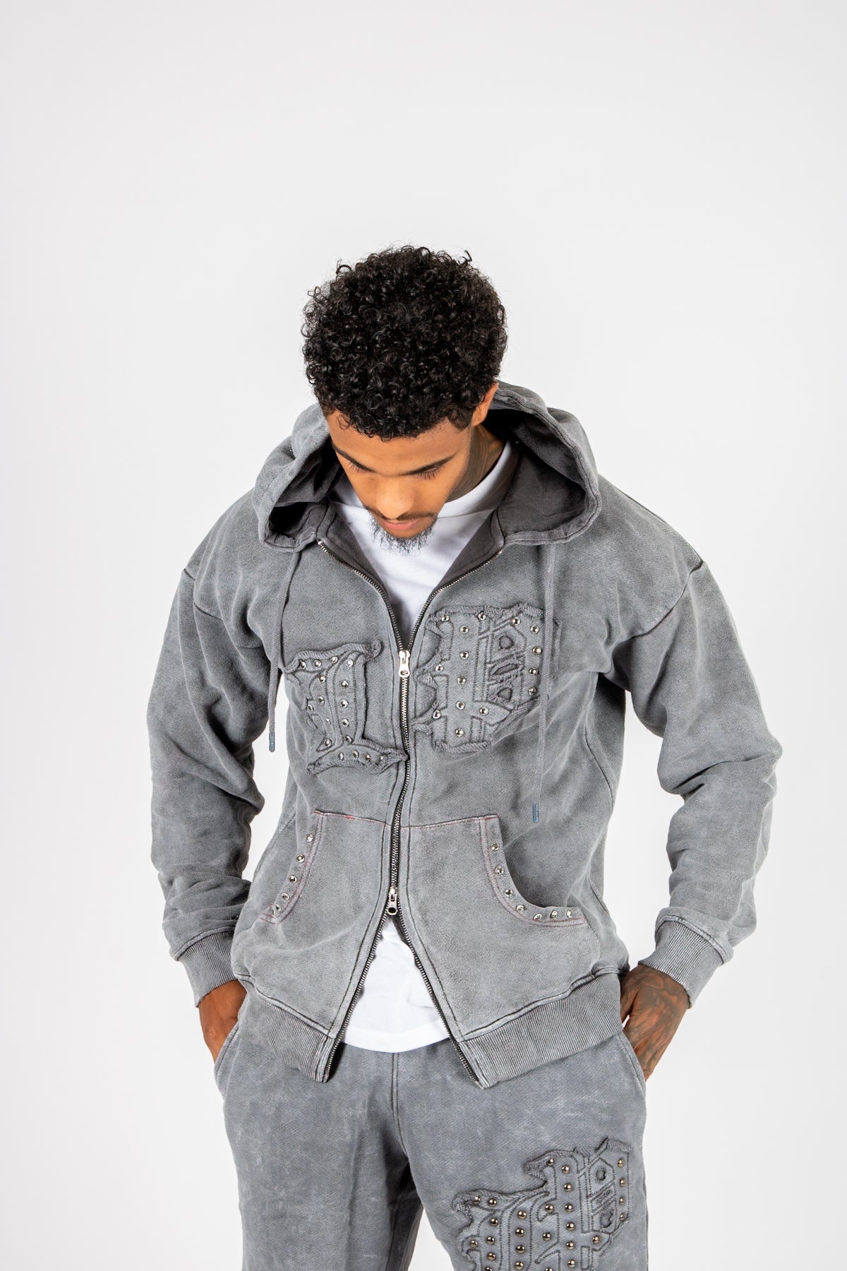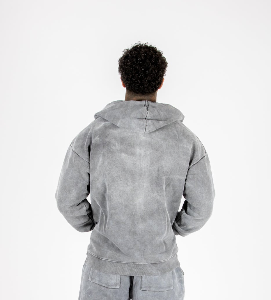 Oversized Washed Grey Appliqué & Stud Detail Hoodie
