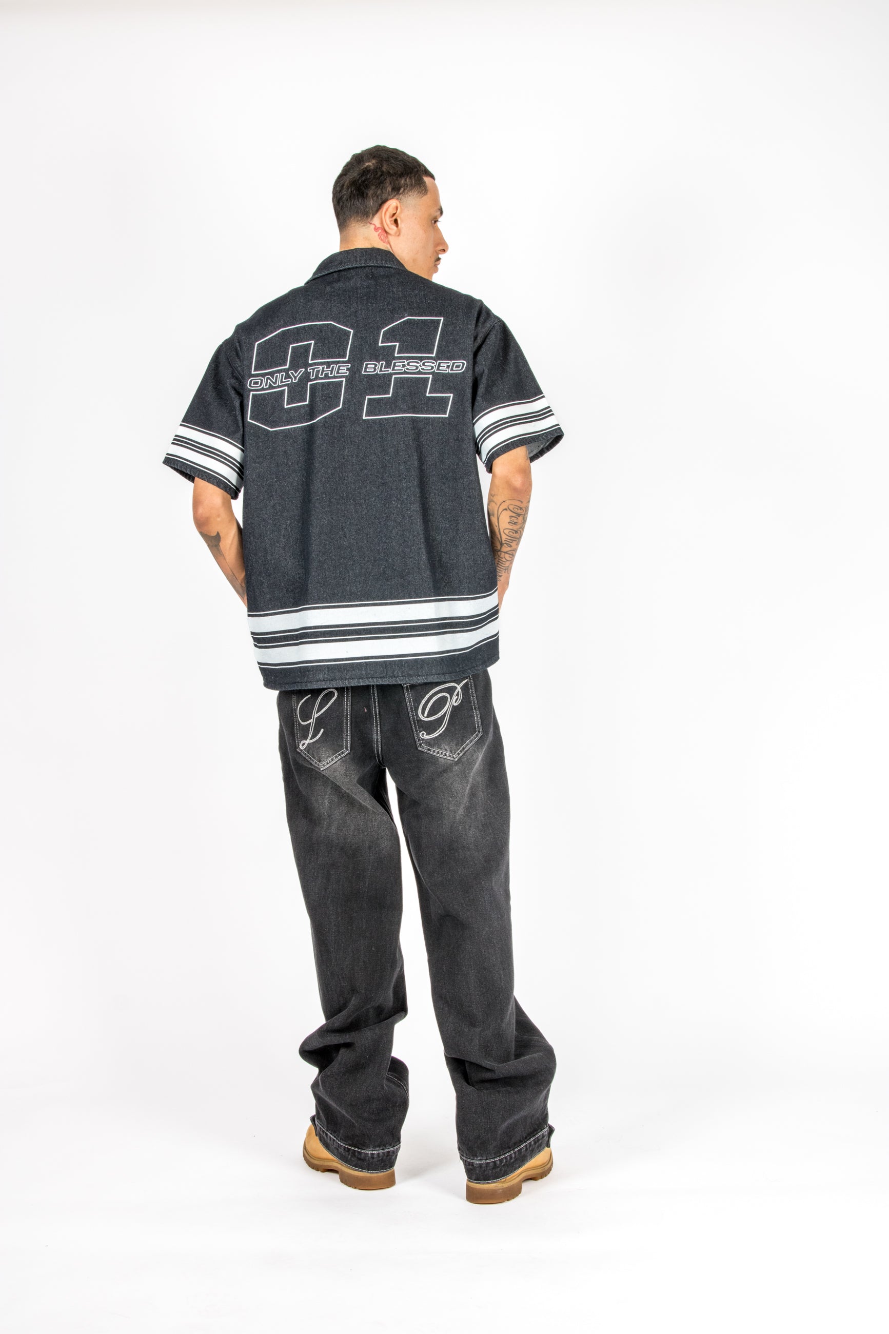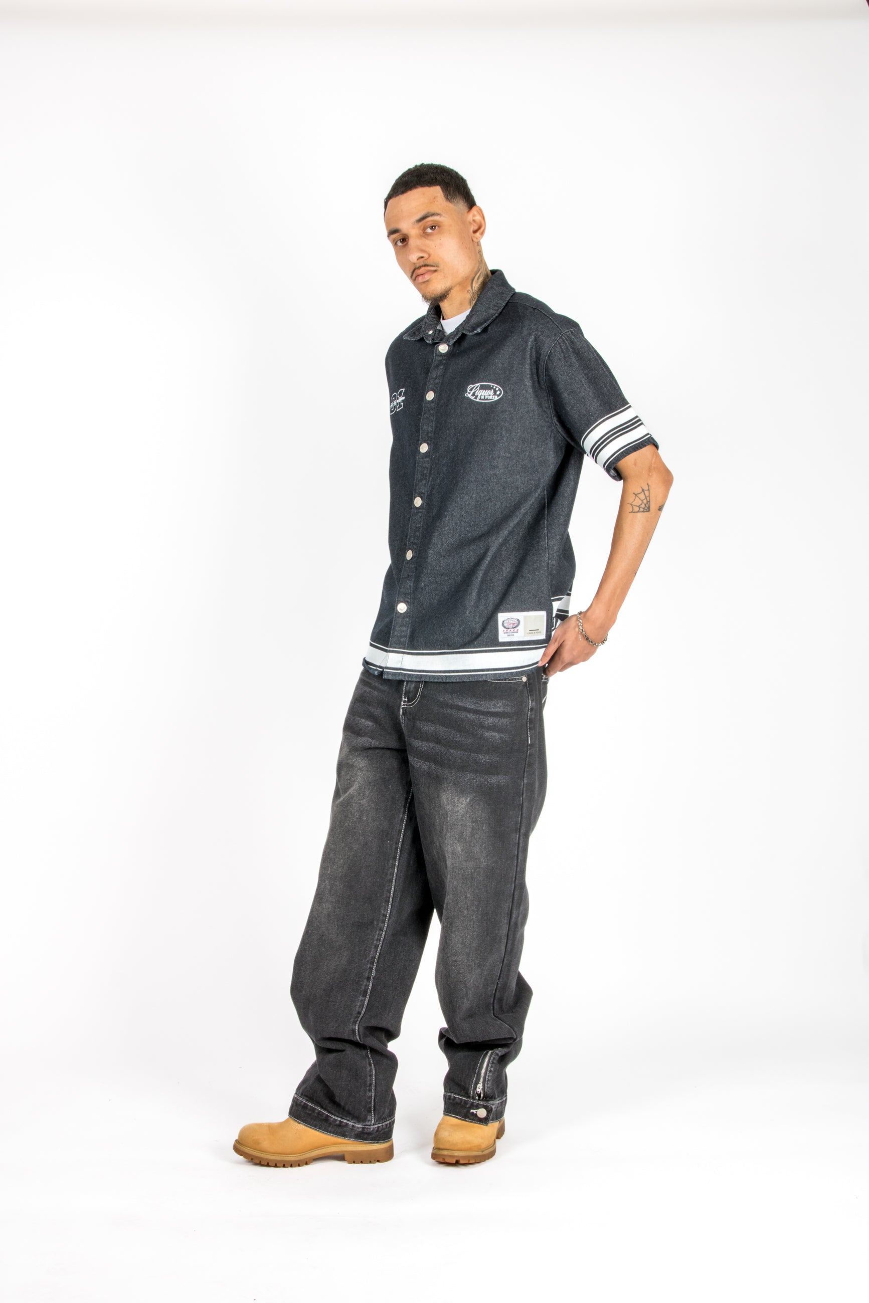 Washed Black Contrast Stitch Barrel Varsity Jeans
