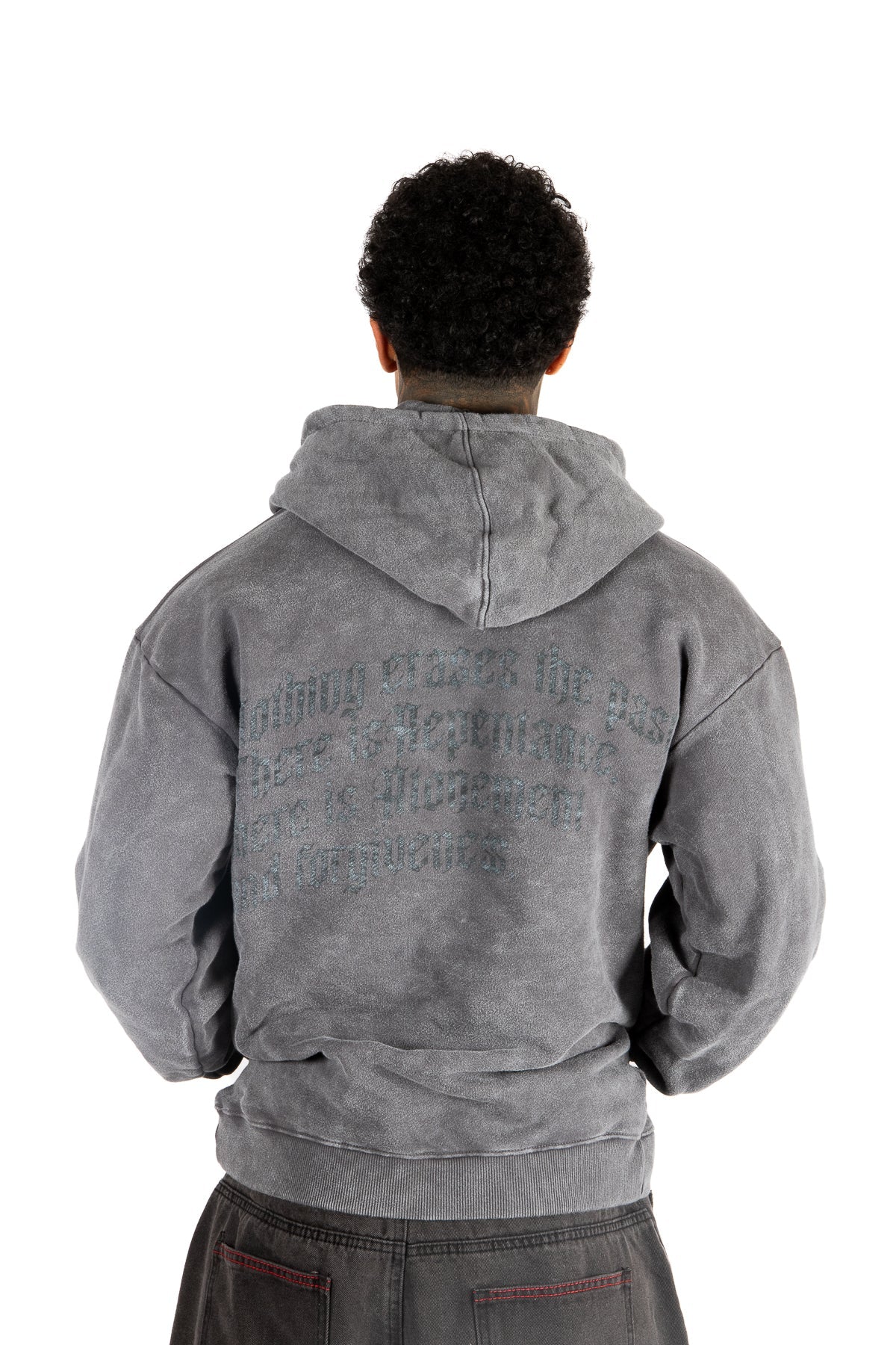 Washed for the streets. Acid-treated grey fleece with faded text print to back. Relaxed silhouette built for layering over tees or solo wear.