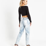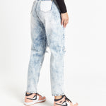 Introducing our Ice-wash Ripped Knee Mom Jeans. These women's jeans effortlessly blend comfort and style, featuring a flattering mom fit that sits perfectly at the waist and a chic ice-wash blue finish. The timeless design is accentuated by subtle distressed detailing, adding a touch of edginess to your look. Versatile and trendy, these jeans are the perfect addition to your wardrobe, taking you from casual outings to stylish gatherings with ease.