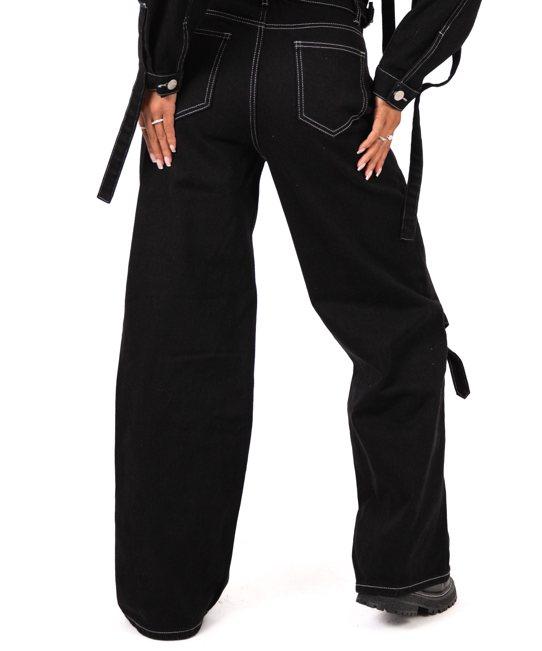 Black Contrast Stitch & Buckle Straight Leg Jeans