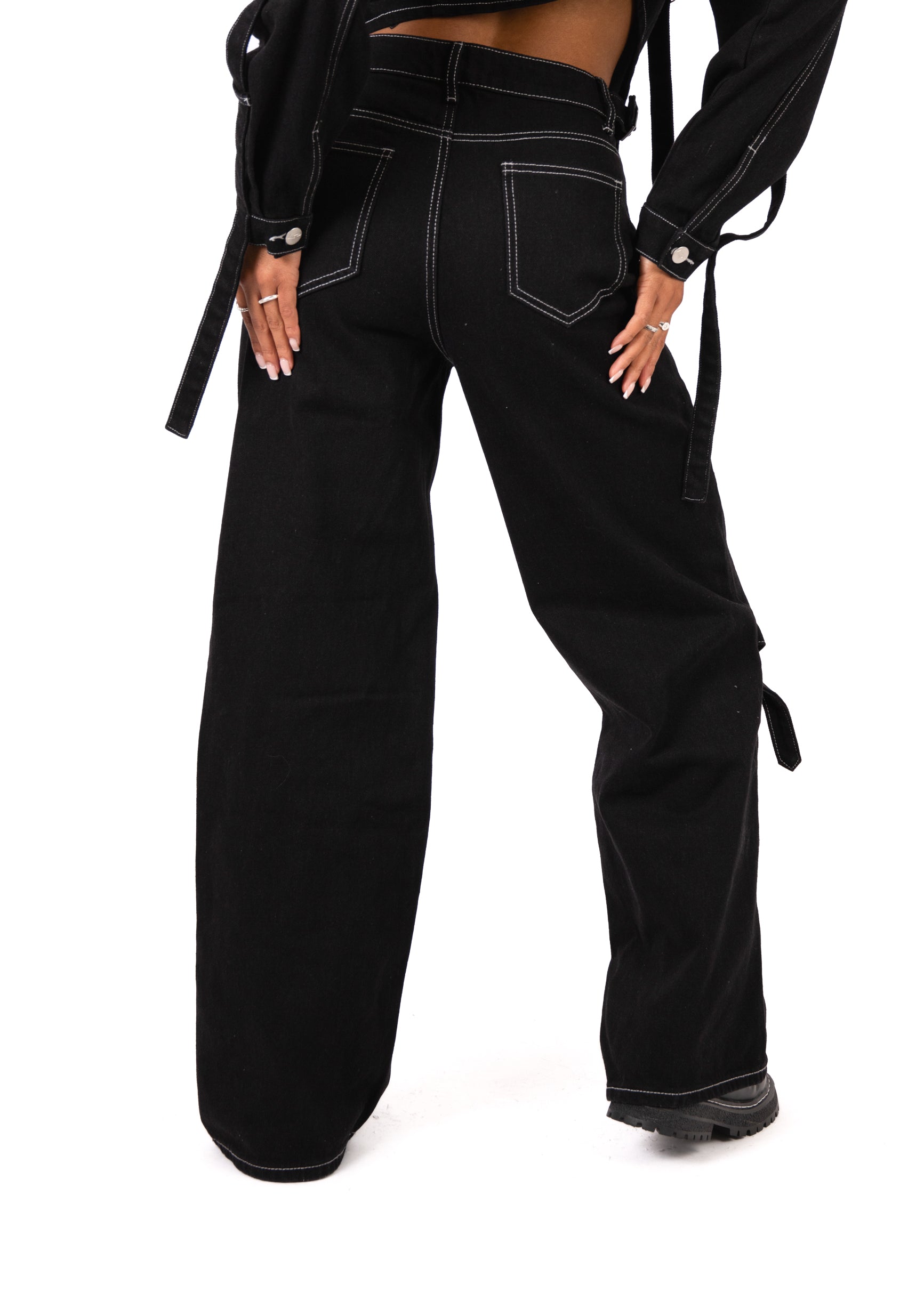 Black Contrast Stitch & Buckle Straight Leg Jeans