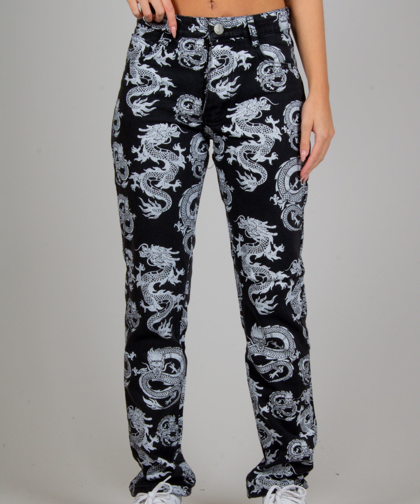 All-Over Dragon Print Straight Leg Jean