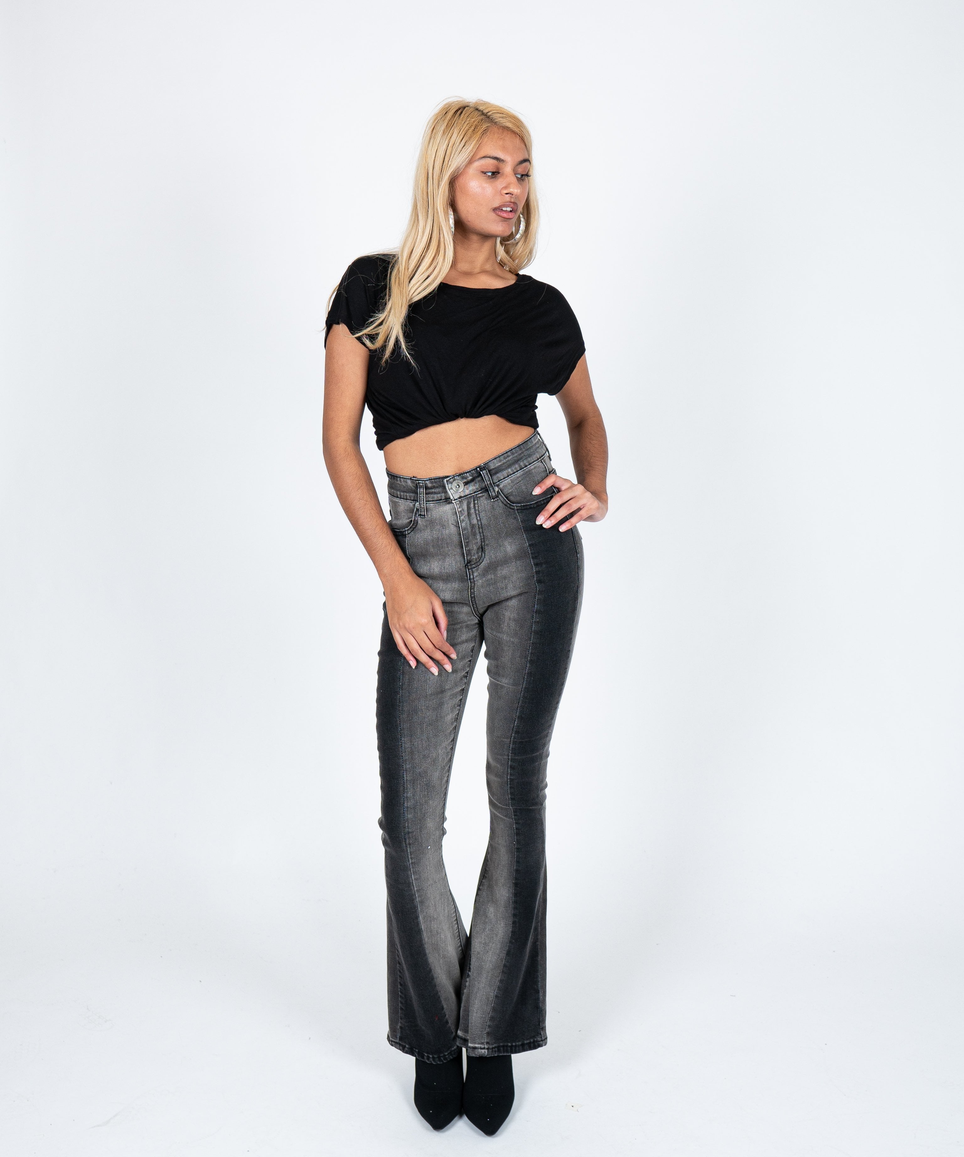 High Rise Skinny Two Tone Denim Flare In Washed Black