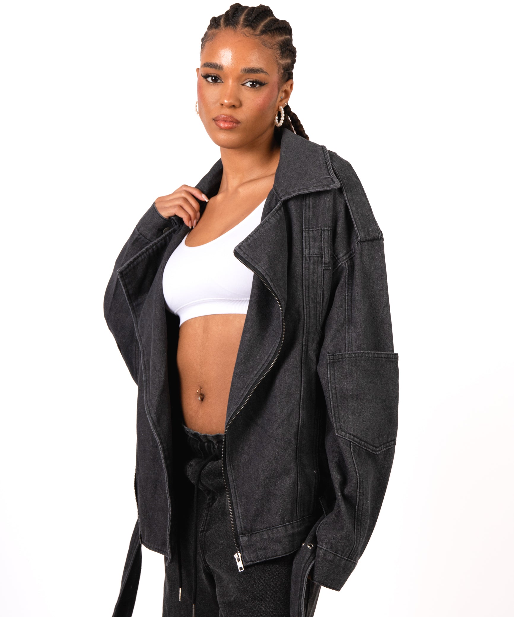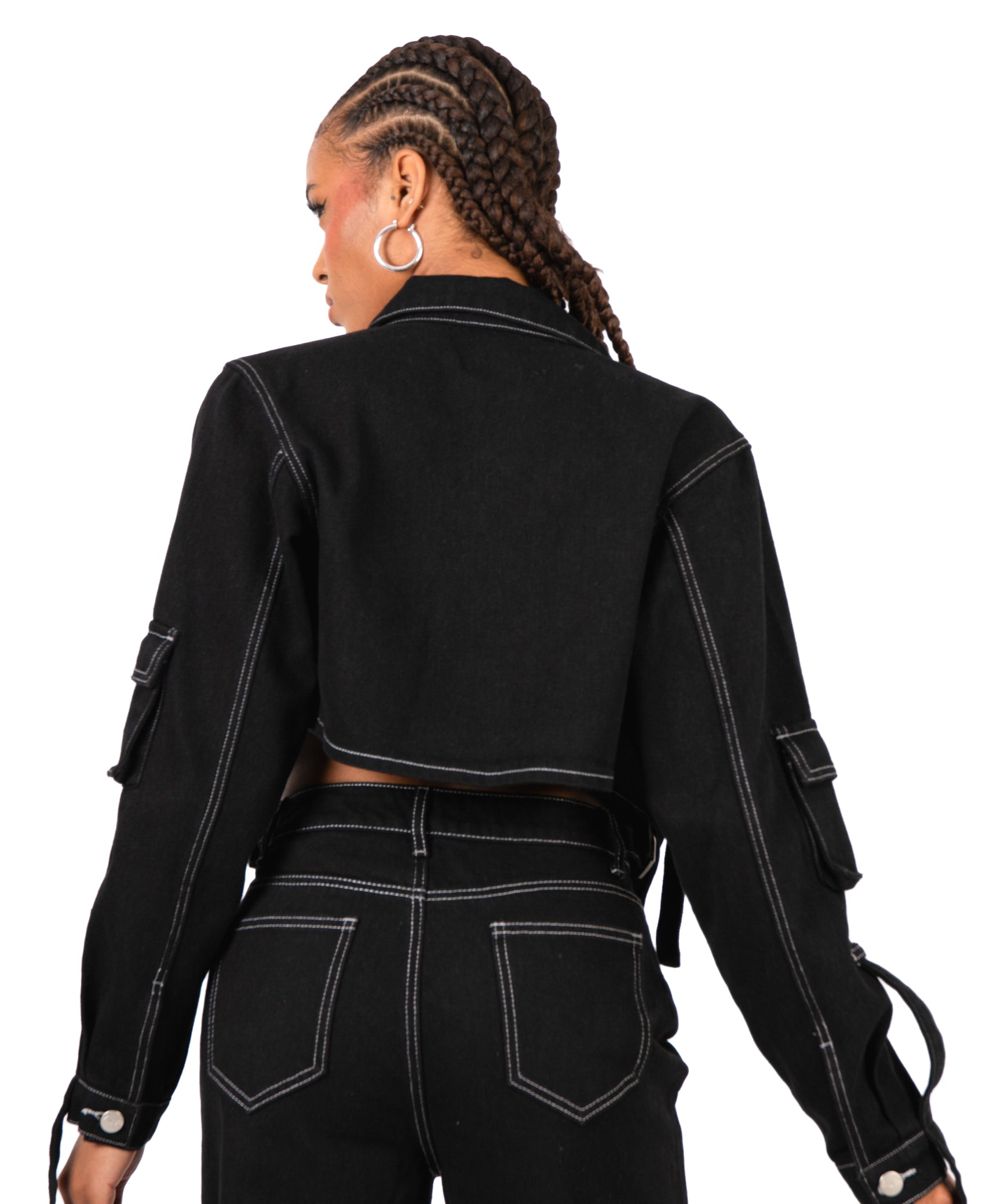 Black Contrast Stitch & Utility Pocket Cropped Denim Jacket