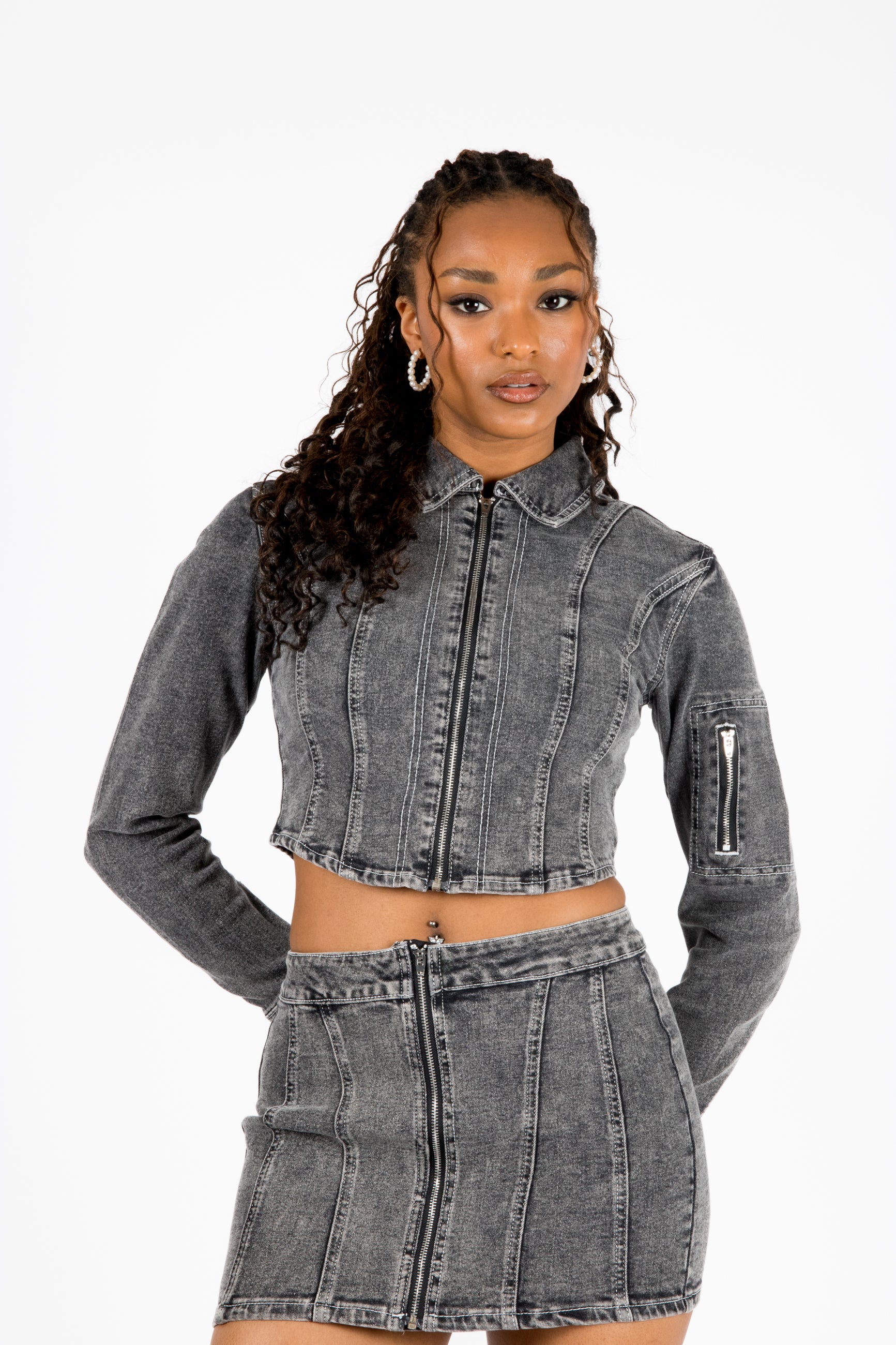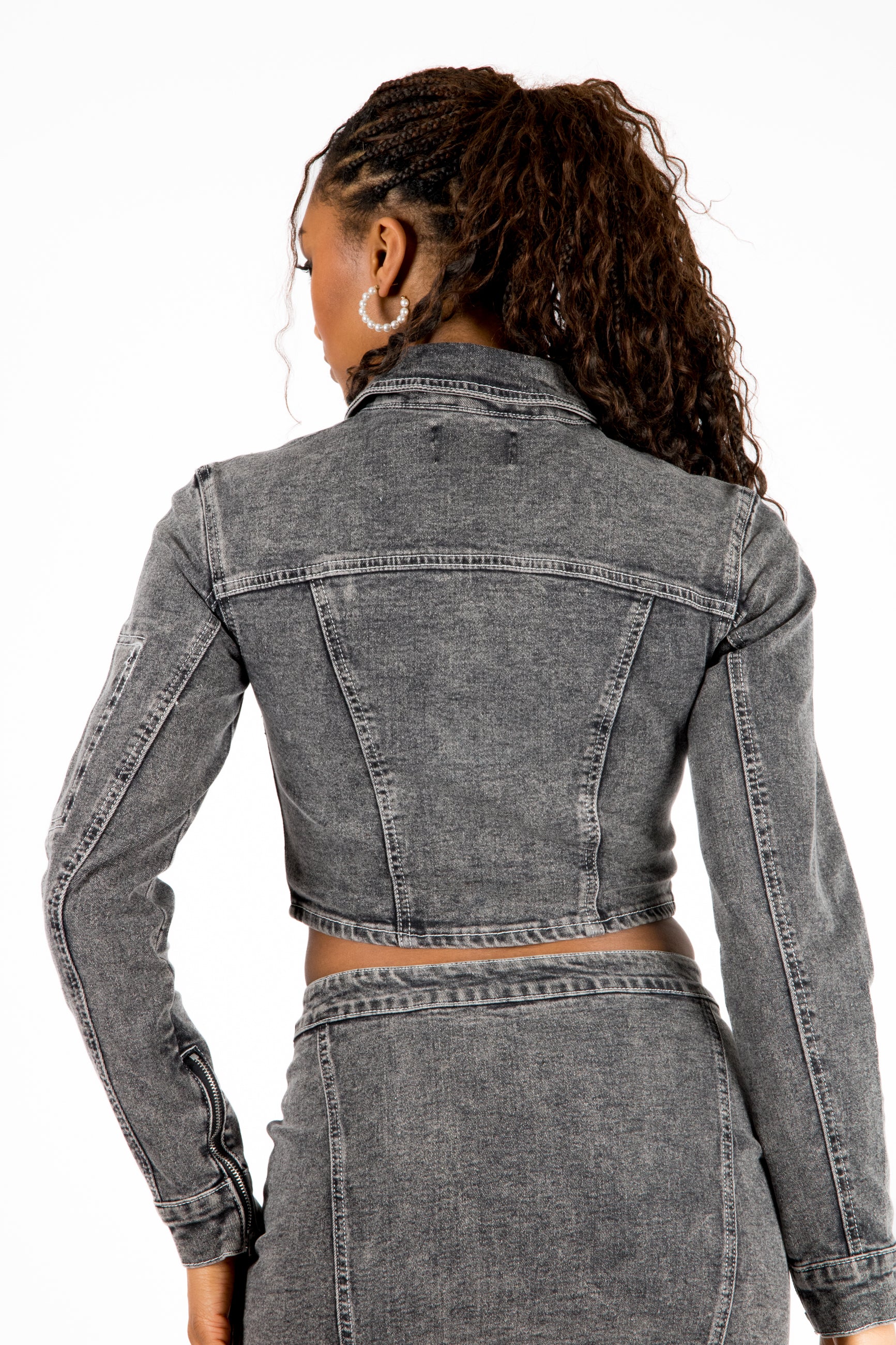Acid-Wash Grey Contrast Stitch Cropped Denim Jacket