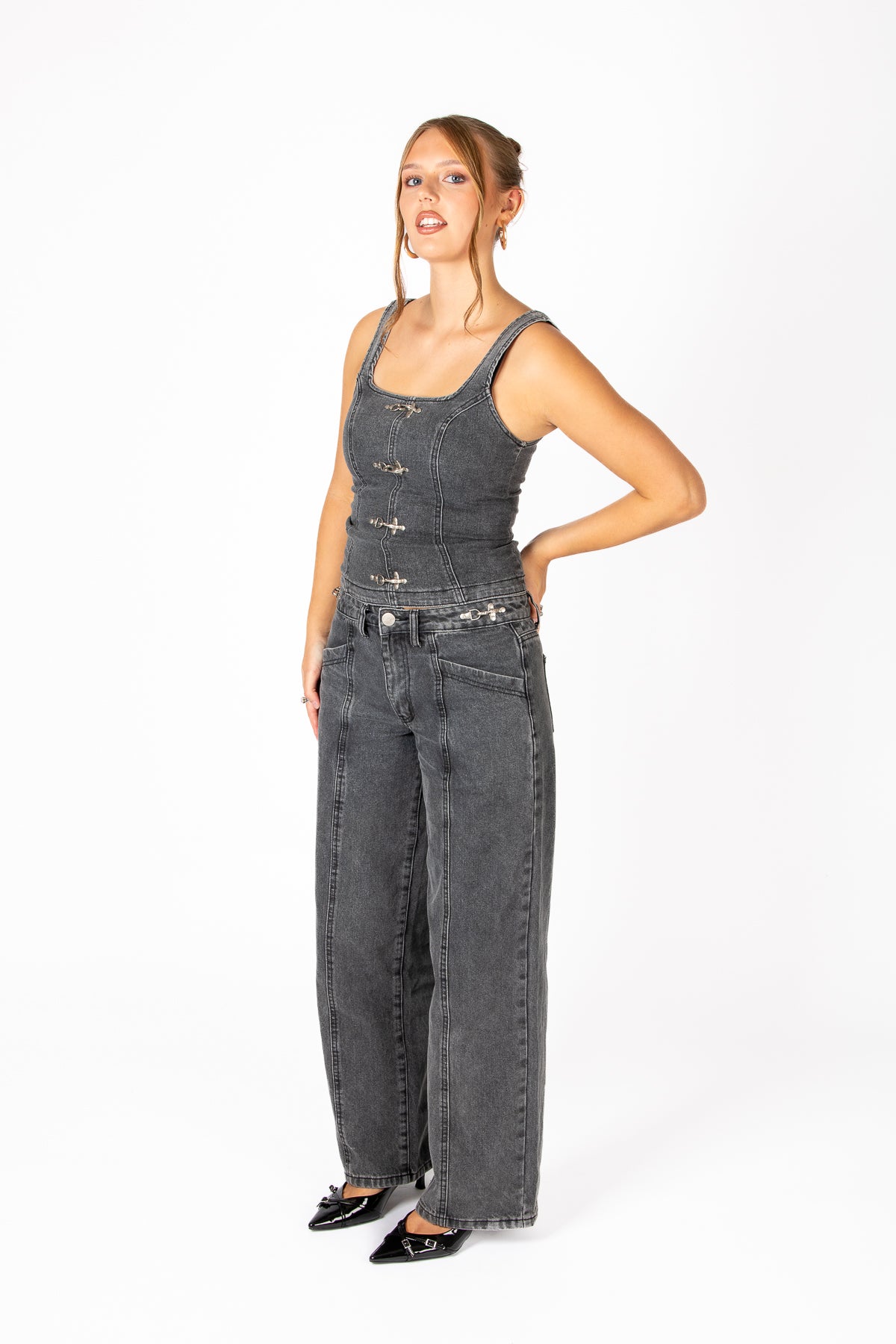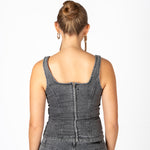 Washed Black Denim Corset With Buckle Detail
