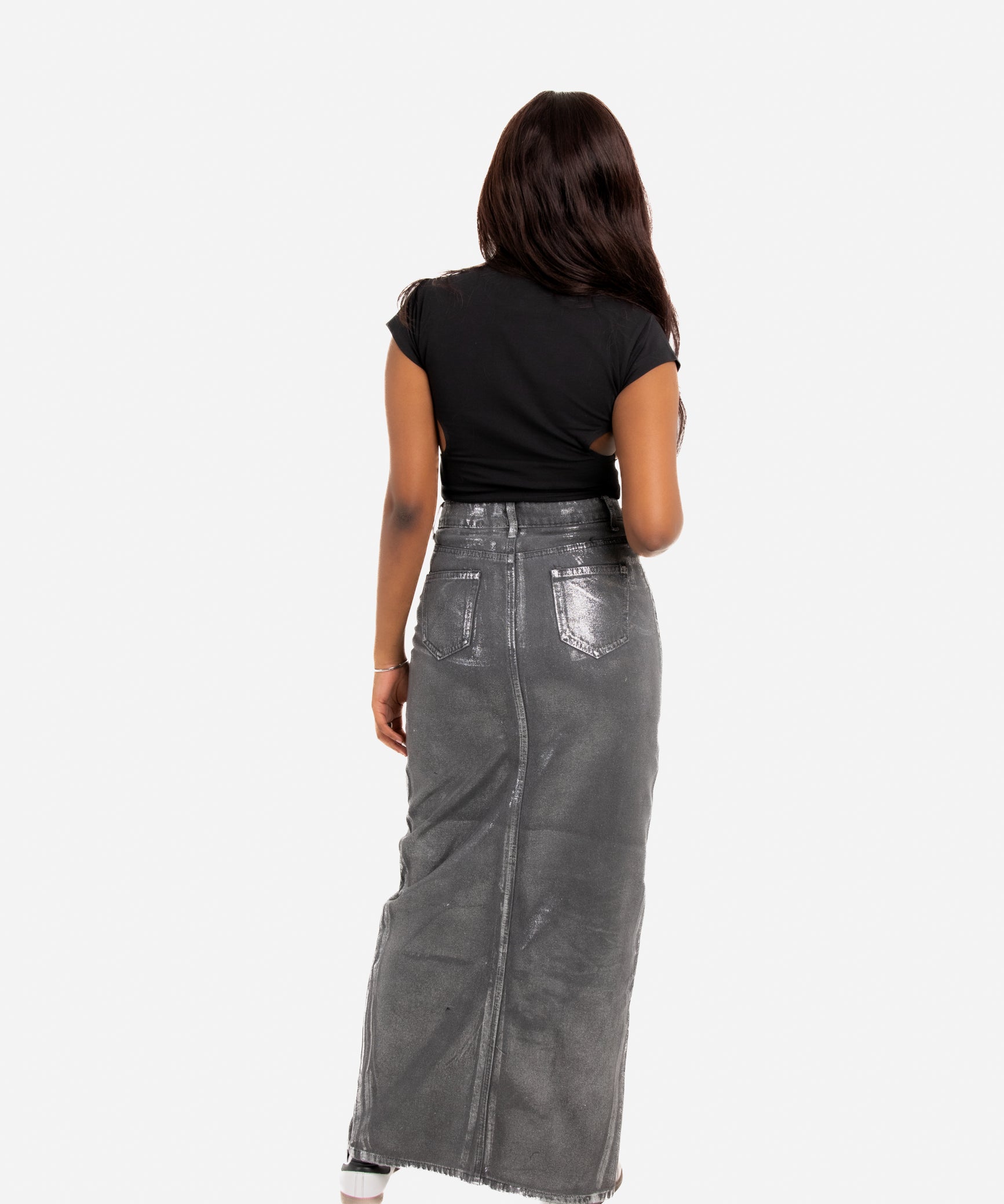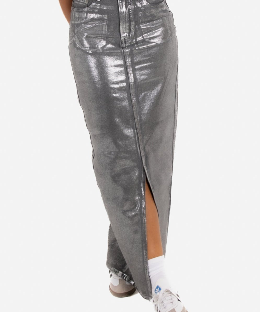 Maxi-Length Metallic Silver Split Skirt