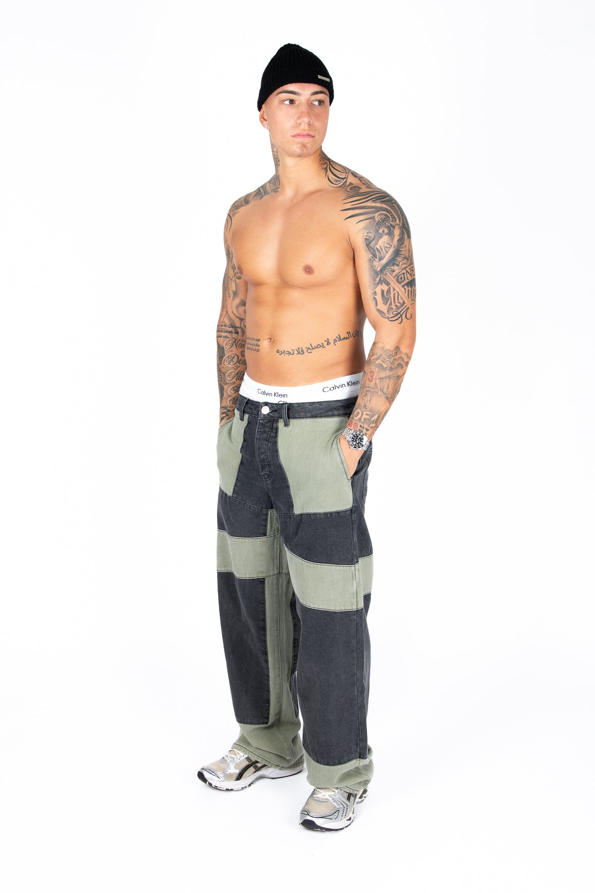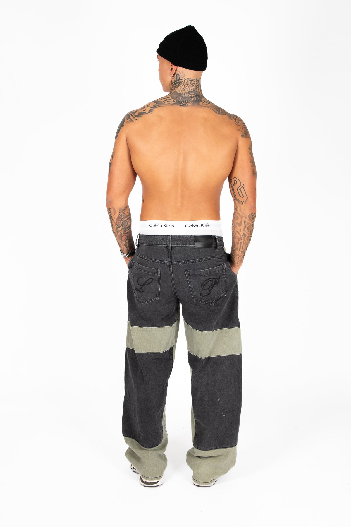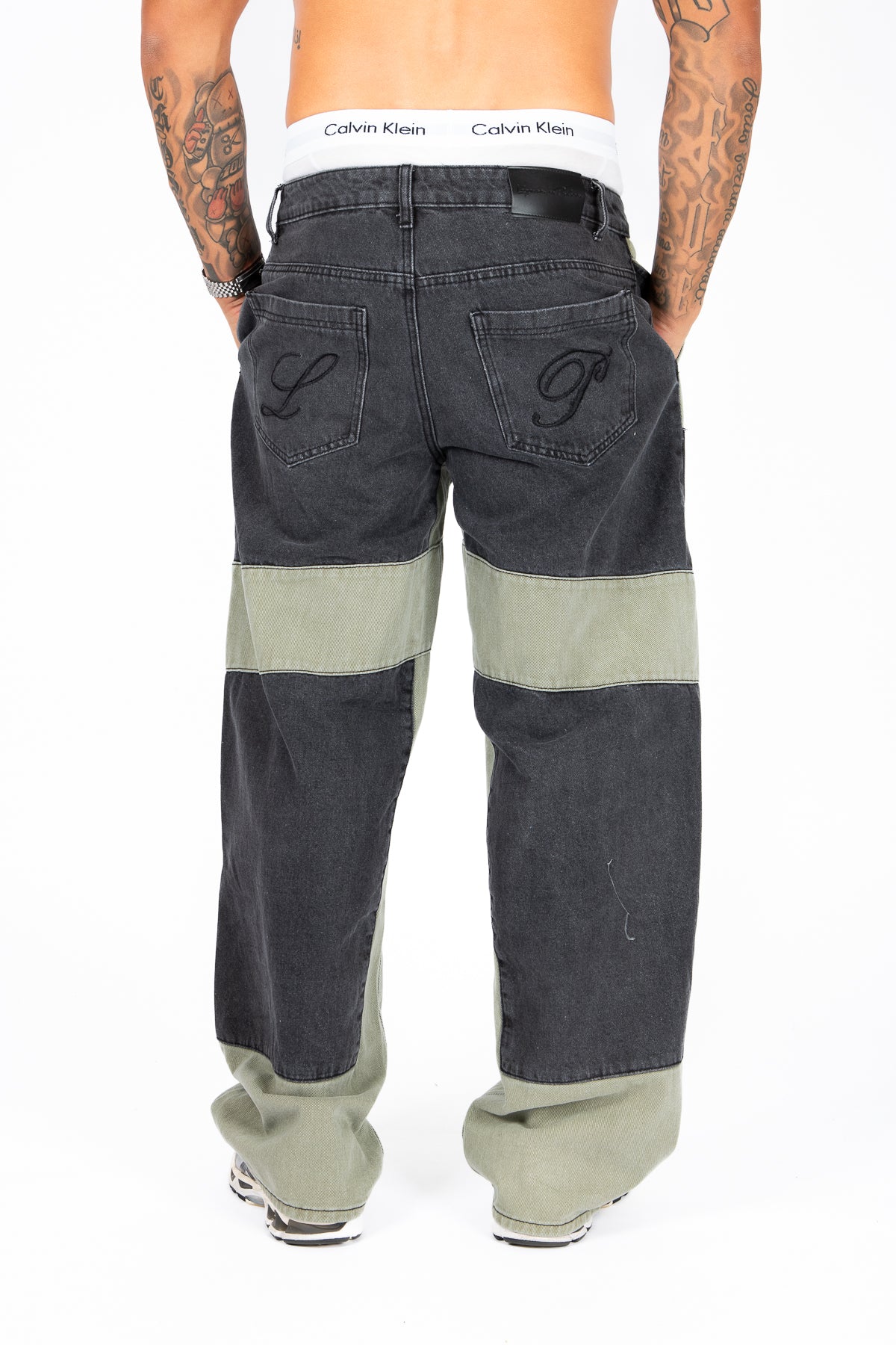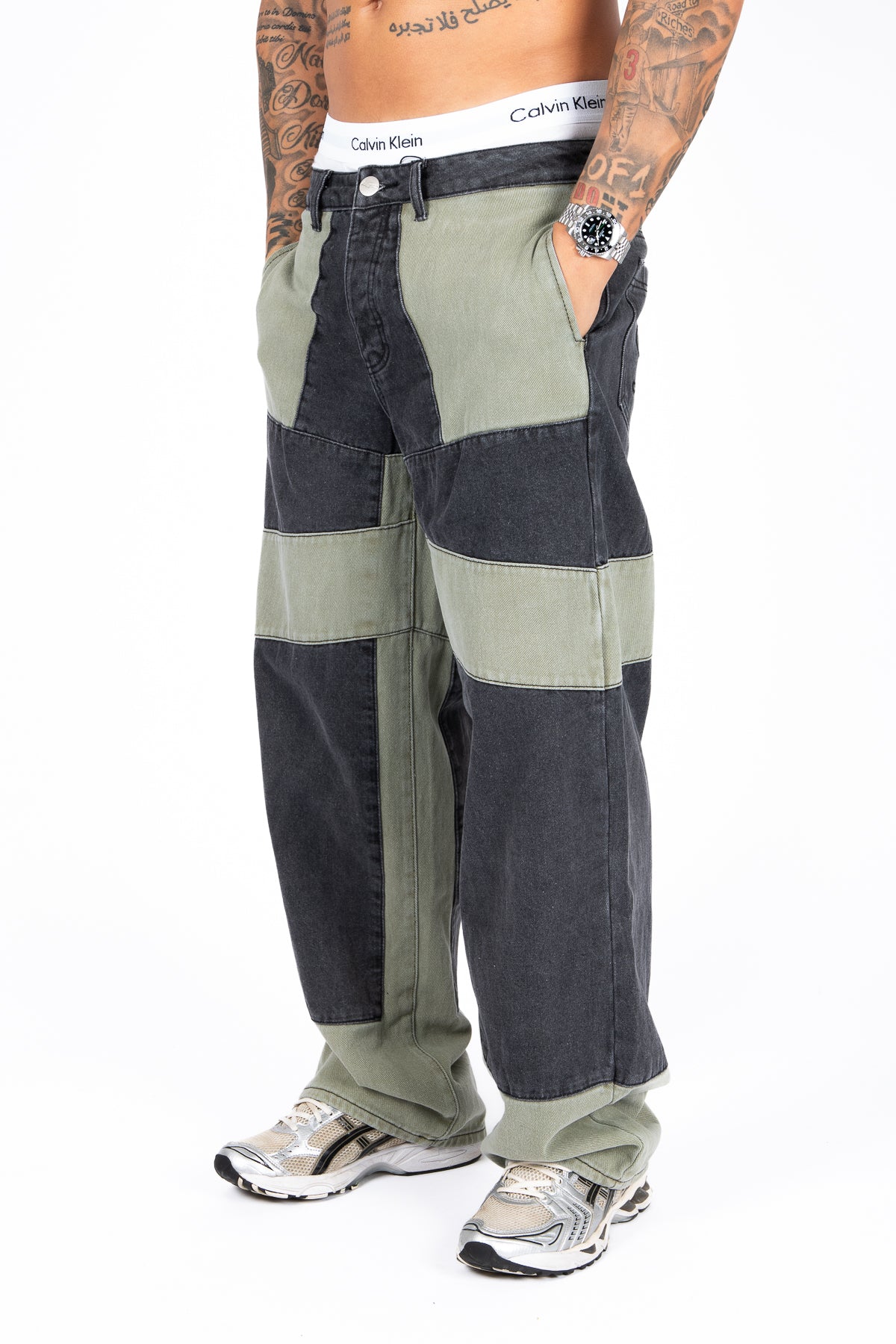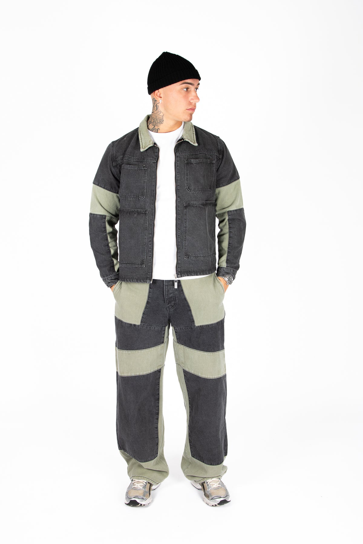 Khaki & Black Biker Panelled Jeans