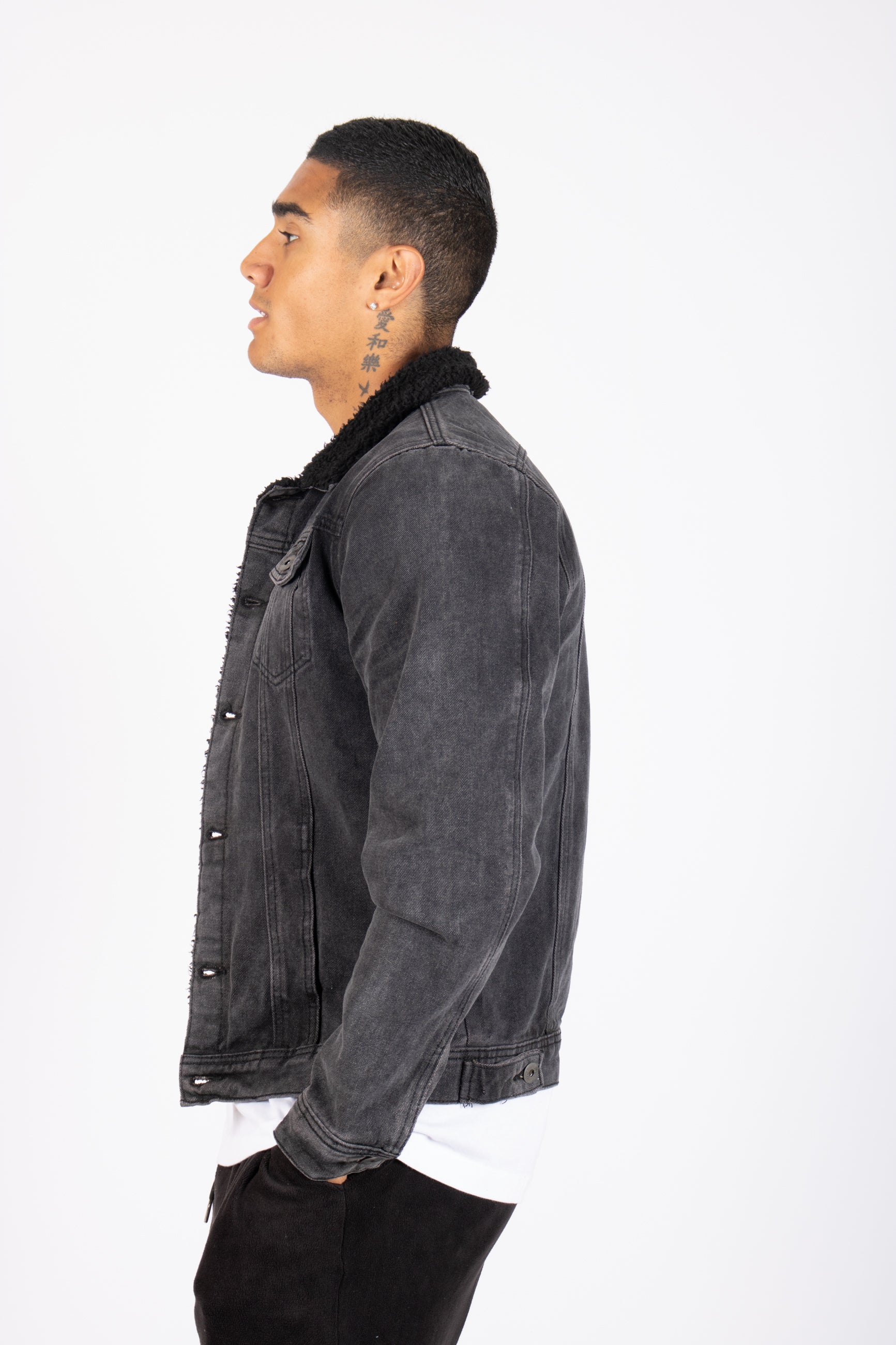 Norton Slim Fit Denim Jacket With Borg Collar In Washed Black