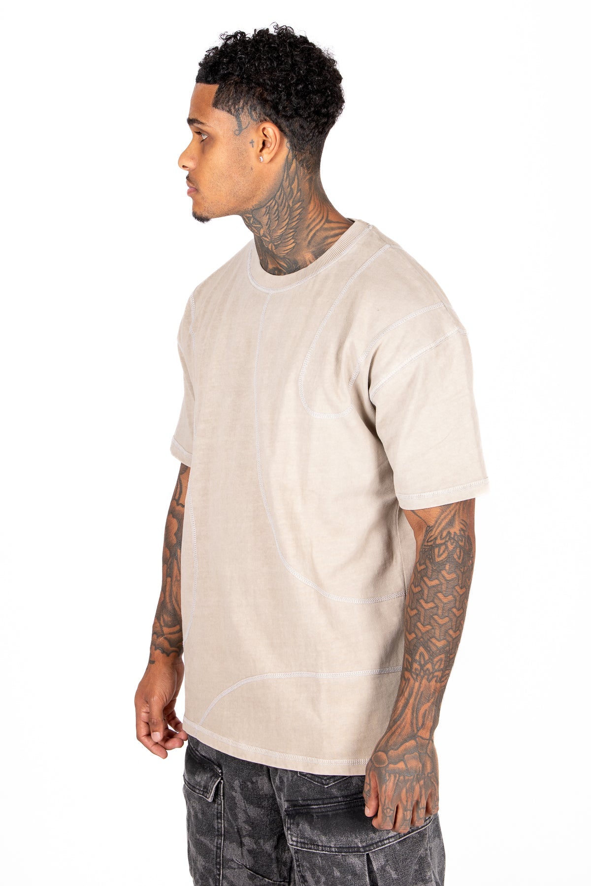 Liquor N Poker relaxed fit raw edge emblem t-shirt in beige. Features stitched design detail with drop shoulder construction.